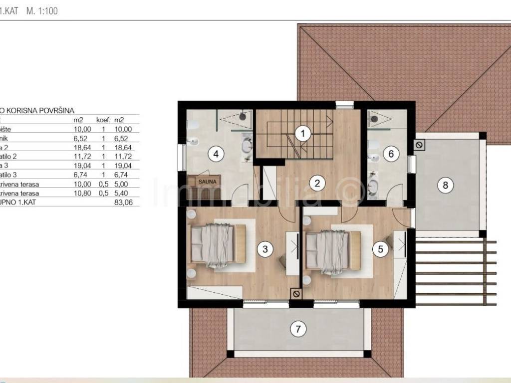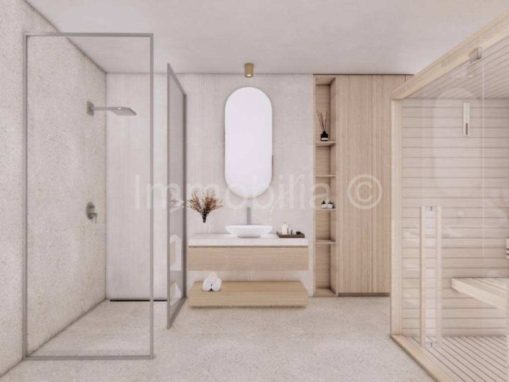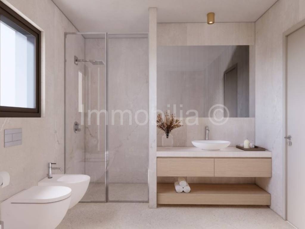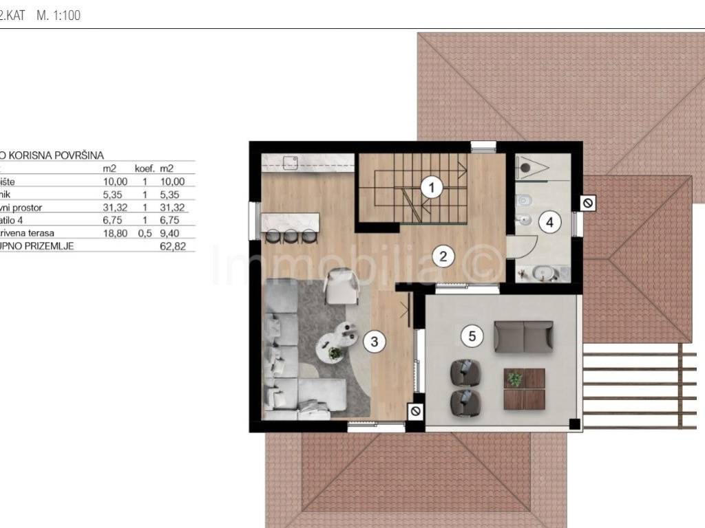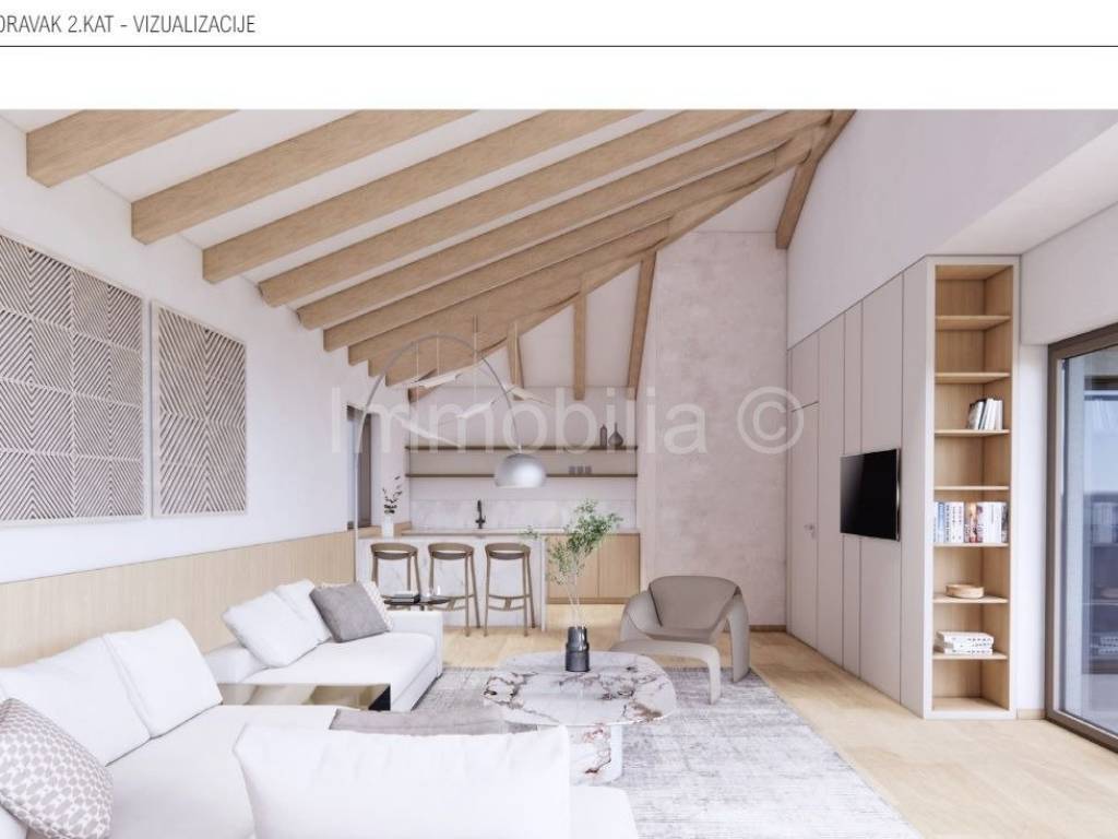 U prizemlju se nalaze dnevni boravak , kuhinja i blagovaonica , kupaonica i 1 spavaća soba , na 1. katu se nalaze 2 velike spavaće sobe sa kupaonicama i velikim terasama, a 2.kat se sastoji od velike open space prostorije sa kupaonicom i izlazom na veliku natkrivenu terasu sa fantastičnim neometanim pogledom na more. Ovaj 2.kat može se urediti u dodatni dnevni boravak sa fantastičnim pogledom ili u master bedroom, teretanu , wellness...