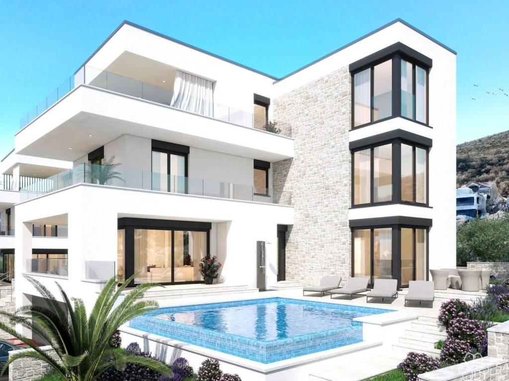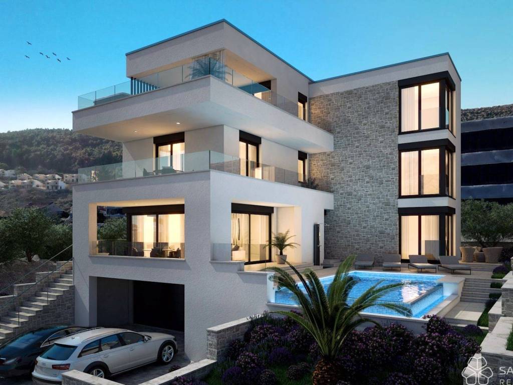 Vila je raspoređena na četiri etaže podrum, prizemlje, prvi i drugi kat, s ukupnom neto obračunskom površinom od 342 m2. Stambeni dio prostire se na 260 m2 i obuhvaća četiri prostrane spavaće sobe s vlastitim kupaonicama, dodatna dva toaleta za goste, prozračni dnevni boravak s kaminom i blagovaonicu povezanu s potpuno opremljenom kuhinjom. Velike staklene stijene povezuju unutrašnjost s terasama i bazenom, pružajući neprekidni doživljaj prirode i svjetlosti.