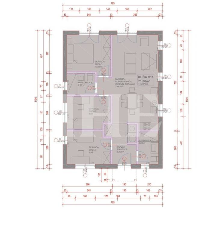 Tip A - prizemnica koja se sastoji od ulaznog hodnika, dnevnog boravka s kuhinjom i blagavaonicom, tri spavaće sobe i dvije kupaonice ukupne površine 72 m2 - cijena 217.500 eura