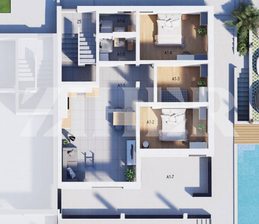 Apartman A1 se sastoji od ulaznog hodnika, dnevnog boravka s blagavaonicom i kuhinjim, tri spavaće sobe, dvije kupaonice i velike terasa, bazena od 40 m2, ukupne prodajne površine 119 m2 i dva vanjska parkirna mjesta - cijena 600.000 eura
