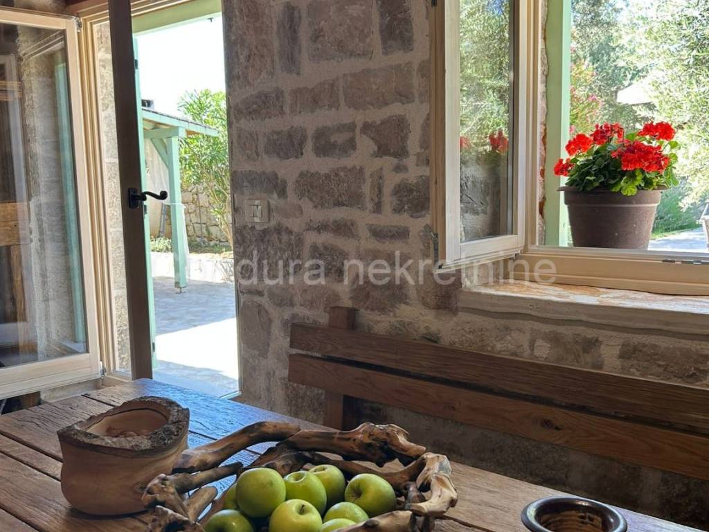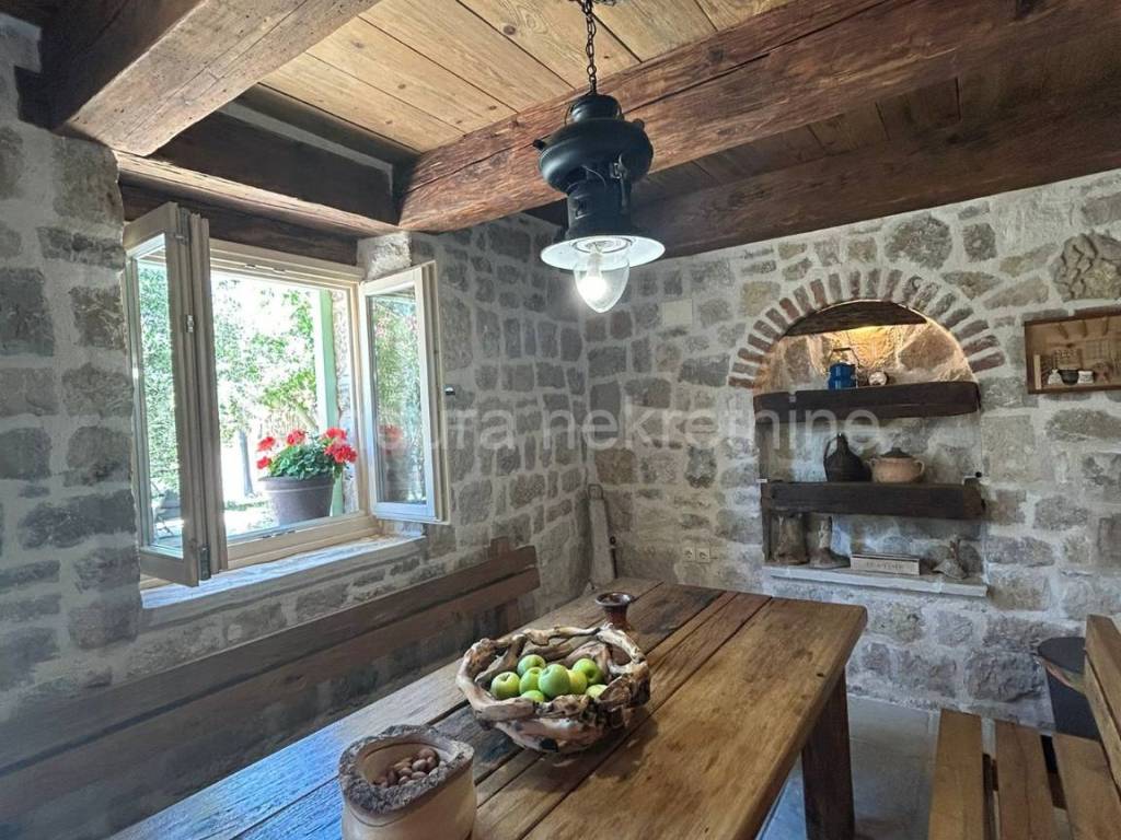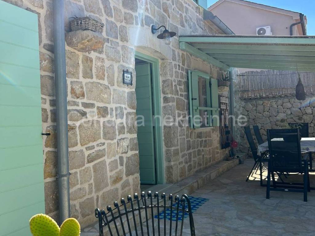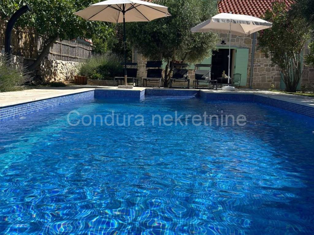 Izvorna stara dalmatinska kamena kuća sagrađena početkom 20. stoljeća. Sastoji se od prizemlja i potkrovlja te joj je ukupna neto površina ca 110 m2. U donjem dijelu kuće se nalazi dnevni dio sa kuhinjom/blagovaonom i dnevnim boravkom te kupaonica i jedna spavaća soba. Središte donjeg dijela je veliki kameni kamin koji seže do stropa i dijeli prostoriju na dva dijela. Unutarnjim drvenim skalama se ide u potkrovlje u kojem se nalaze dvije prostrane spavaće sobe (svaka 25 m2) i WC.Dvorište kuće je također uređeno u dalmatinskom stilu sa stablima maslina i smokava. Ispred kuće se nalazi i bazen (32 m2), vanjski tuš i roštilj.Kuća je u svojoj dugoj povijesti doživjela nekoliko renovacija a posljednja je bila 2014. godine kada je u potpunosti obnovljena i adaptirana. Prilikom obnove koristio se izvorni kamen kuće, sačuvani su stari zidovi (debljine 55 cm), stare cigle te su postavljene nove masivne grede kao potpornji potkrovlju a koristilo se drvo stare slavonske hrastovine. Stara slavonska hrastovina se koristila i prilikom izrade većine namještaja koji je unikatni ručni rad. Prilikom renovacije zadržane su i originalne niše u kuhinji i dnevnom boravku te veliki luk iznad kreveta u spavaćoj sobi u prizemlju.Kuća se koristi u turističke svrhe već 7 godina i ostvaruje izvanredne rezultate sa preko 120 dana godišnje popunjenosti.
