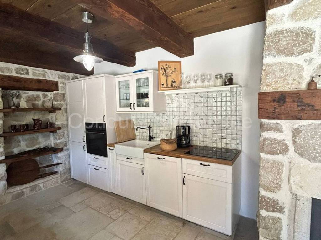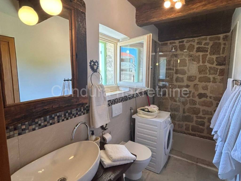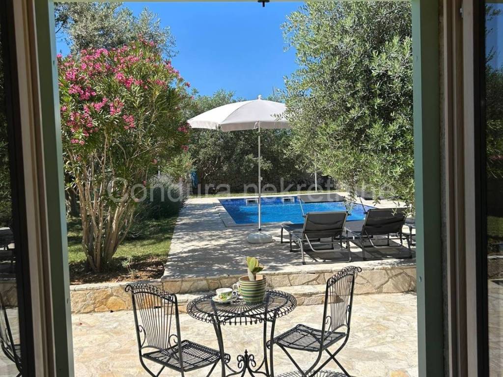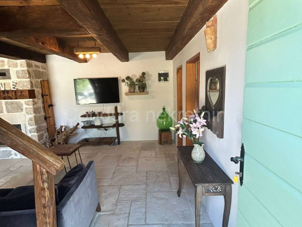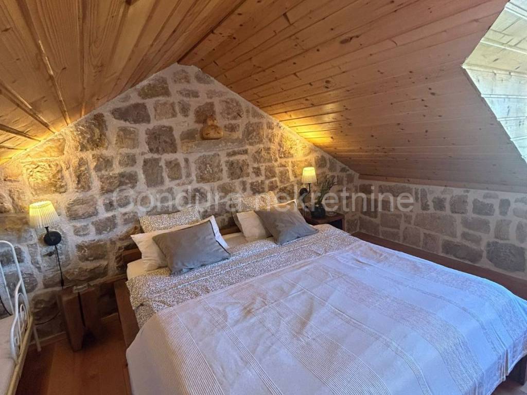 Izvorna stara dalmatinska kamena kuća sagrađena početkom 20. stoljeća. Sastoji se od prizemlja i potkrovlja te joj je ukupna neto površina ca 110 m2. U donjem dijelu kuće se nalazi dnevni dio sa kuhinjom/blagovaonom i dnevnim boravkom te kupaonica i jedna spavaća soba. Središte donjeg dijela je veliki kameni kamin koji seže do stropa i dijeli prostoriju na dva dijela. Unutarnjim drvenim skalama se ide u potkrovlje u kojem se nalaze dvije prostrane spavaće sobe (svaka 25 m2) i WC.Dvorište kuće je također uređeno u dalmatinskom stilu sa stablima maslina i smokava. Ispred kuće se nalazi i bazen (32 m2), vanjski tuš i roštilj.Kuća je u svojoj dugoj povijesti doživjela nekoliko renovacija a posljednja je bila 2014. godine kada je u potpunosti obnovljena i adaptirana. Prilikom obnove koristio se izvorni kamen kuće, sačuvani su stari zidovi (debljine 55 cm), stare cigle te su postavljene nove masivne grede kao potpornji potkrovlju a koristilo se drvo stare slavonske hrastovine. Stara slavonska hrastovina se koristila i prilikom izrade većine namještaja koji je unikatni ručni rad. Prilikom renovacije zadržane su i originalne niše u kuhinji i dnevnom boravku te veliki luk iznad kreveta u spavaćoj sobi u prizemlju.Kuća se koristi u turističke svrhe već 7 godina i ostvaruje izvanredne rezultate sa preko 120 dana godišnje popunjenosti.