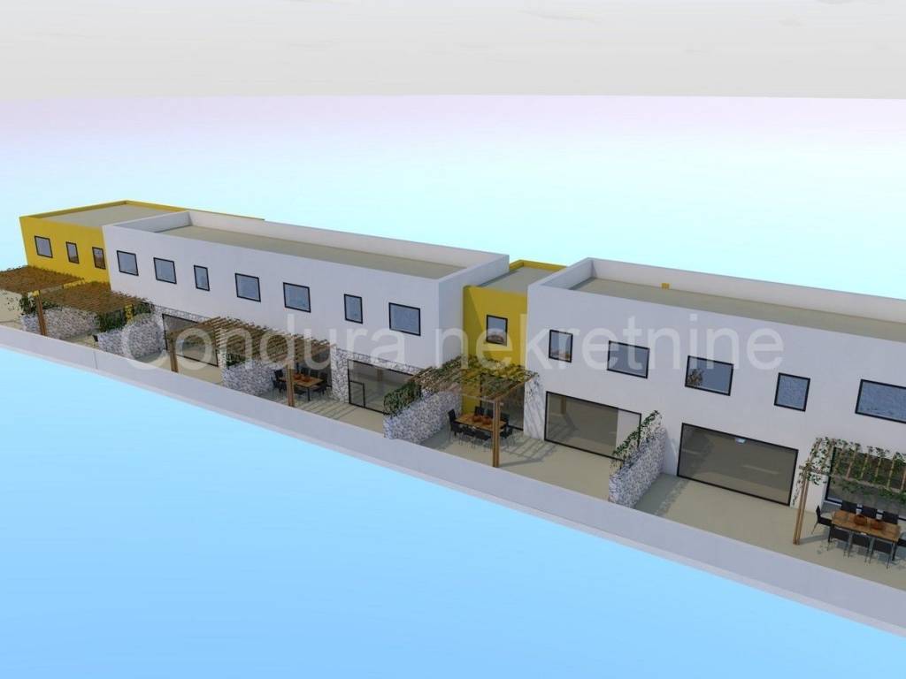 Prodaju se četiri dvoetažna apartmana u nizu na izuzetnoj lokaciji u mirnijem dijelu naselja, a svega 250 m od mora i lijepe pješčane plaže.