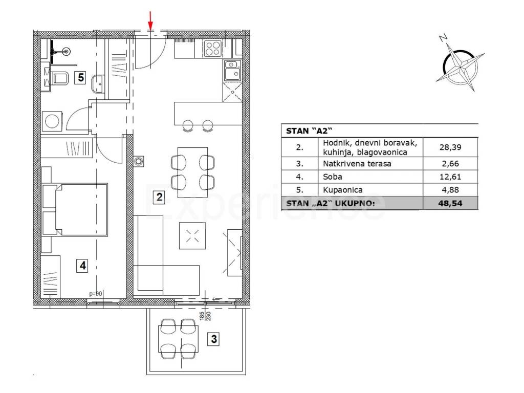 U Vabrigi cca. 900 m od mora, u iznimno mirnom ambijentu na prodaji je dvosoban stan u novogradnji, površine 48,54 m. Stan se nalazi na drugom katu stambene zgrade. Sadrži: otvoreni i svijetao prostor u kojem su smješteni dnevni boravak, kuhinja i blagovaonica sa izlazom na natkrivenu terasu (5,32 m), spavaću sobu i kupaonicu. Zgrada je opremljena liftom.