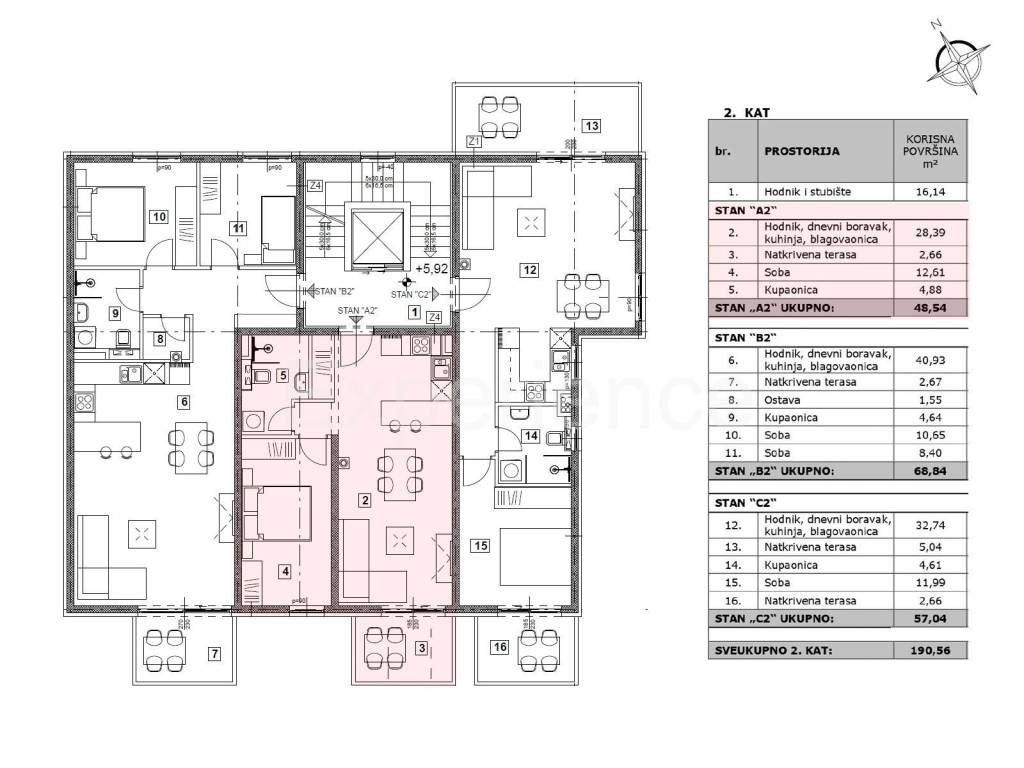 Stanu također pripada spremište (2,40 m) u prizemlju zgrade i parkirno mjesto ispred zgrade.