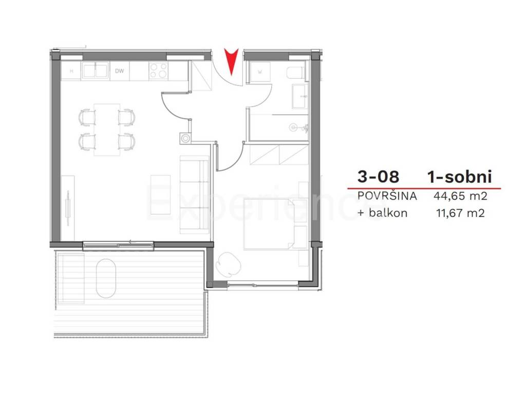 Na prodaji je dvosoban stan, površine 52,49 m. Stan se nalazi na trećem katu stambene zgrade. Sadrži: predsoblje, otvoreni i svijetao prostor u kojem su smješteni dnevni boravak, blagovaonica i kuhinja sa izlazom na balkon (11,67 m), spavaću sobu i kupaonicu. Stanu također pripada spremište (3 m) i garažno parkirno mjesto.