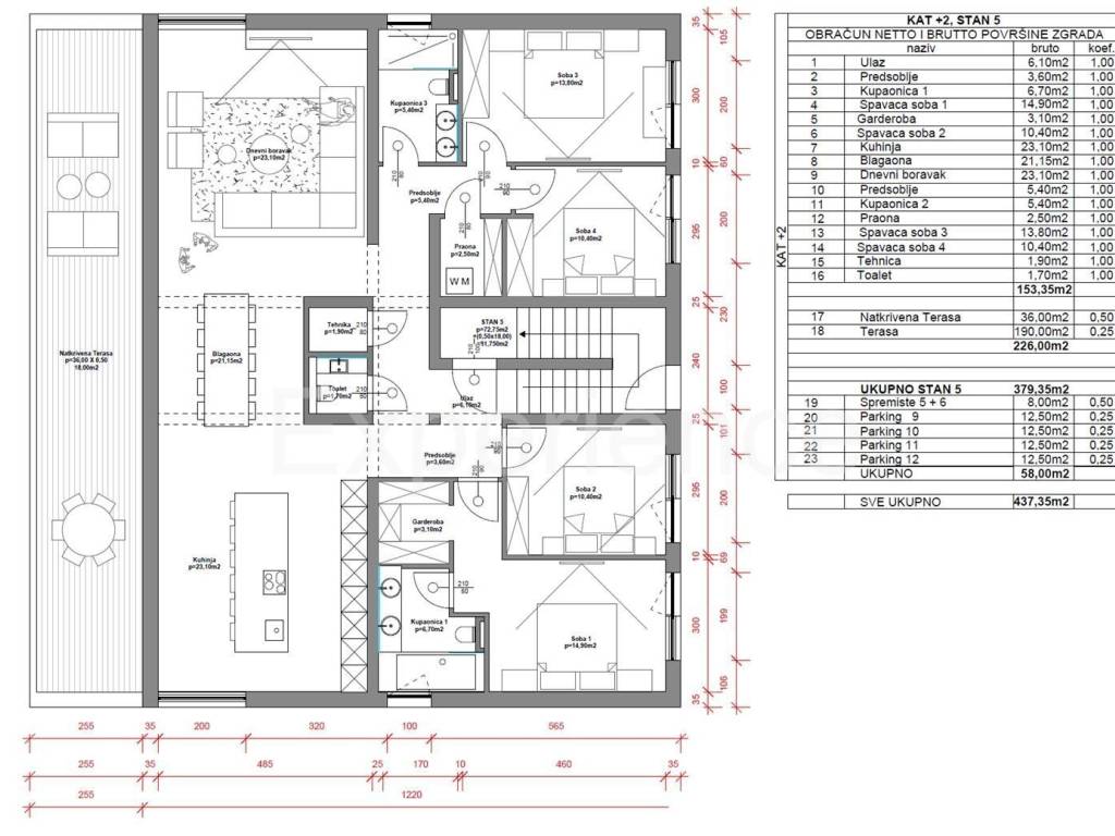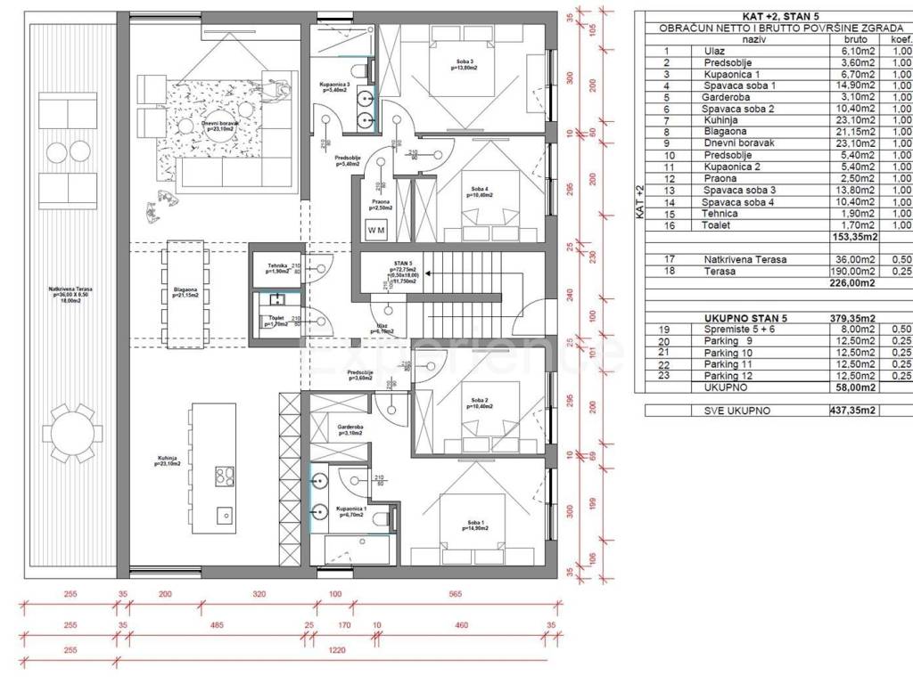 Penthouse se može podijeliti u dvije odvojene cjeline, svaka površine 114.74 m + krovna terasa.
