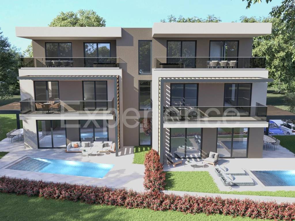 U okolici Poreča cca. 3 km od mora, u iznimno mirnom ambijentu na prodaji je luksuzan dvoetažni stan u novogradnji, ukupne neto površine 124.82 m. Stan se nalazi na prvom katu intimne stambene zgrade sa svega 4 stambene jedinice. Sastoji se od dvije etaže. Prva etaža smještena je na prvom katu, te sadrži: predsoblje, spavaću sobu sa kupaonicom, garderobu i praonicu sa toaletom. Unutarnjim stepeništem pristupa se gornjoj etaži stana, ujedno i zadnjem katu zgrade gdje se nalazi prostrani dnevni boravak, kuhinja i blagovaonica sa izlazom na prostranu natkrivenu terasu (20.42 m), dvije spavaće sobe i kupaonica. Sa terase pruža se prekrasan pogled na more.