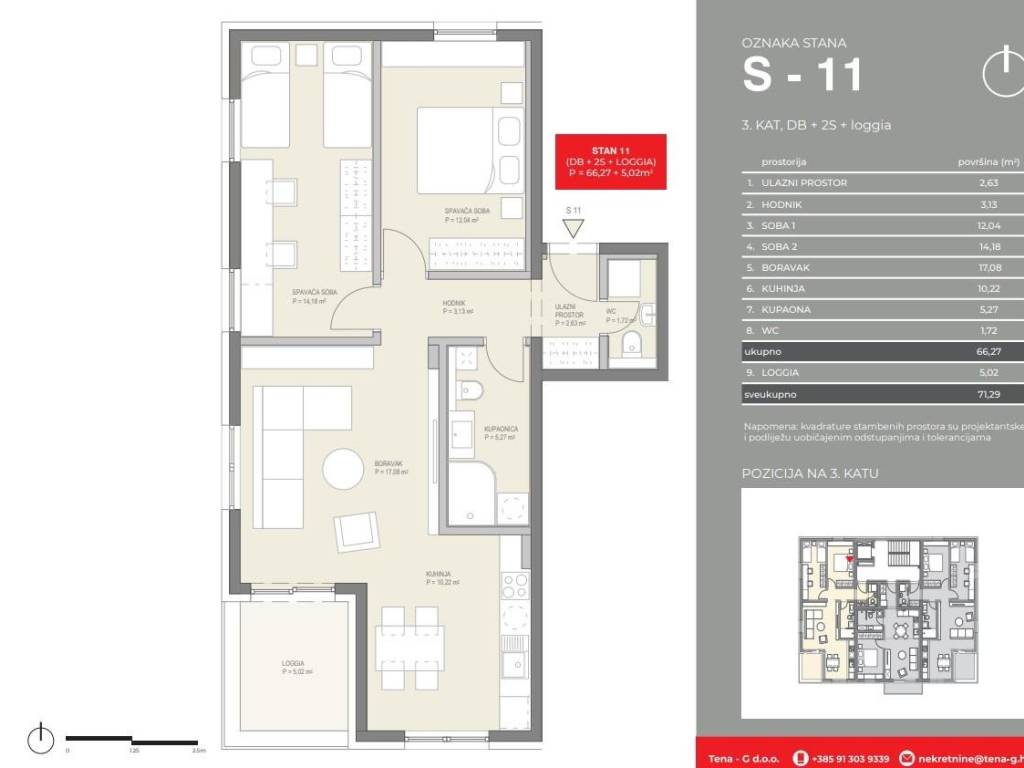 Tlocrt i površina: Ukupna površina stana: 71,29 m2