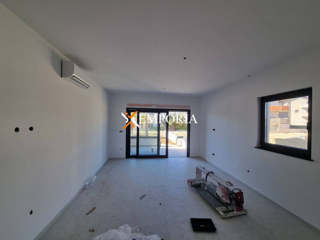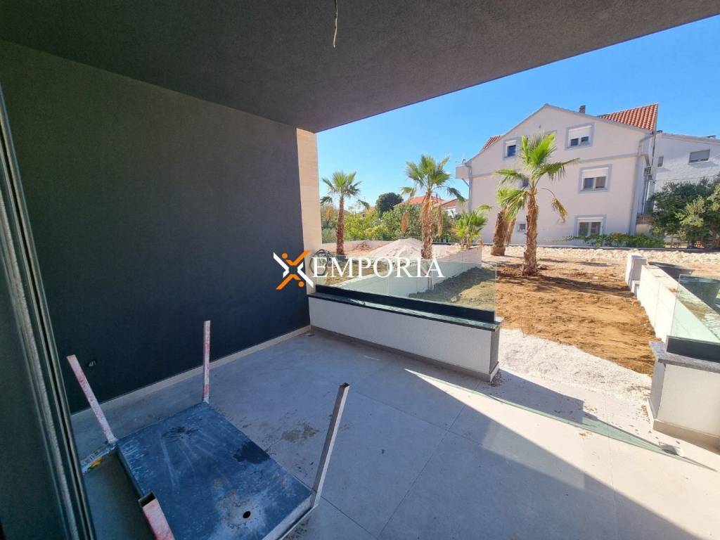Prodaje se stan u novogradnji u Zadru, na Crvenim kućama. Stan se nalazi u prizemlju moderne stambene zgrade koja će biti useljiva do početka 2026. godine. Zgrada ima lift. U blizini zgrade bit će park s drvećem, stazama i dječjim igralištem.Raspored prostorija čine hodnik, dvije spavaće sobe, kupaonica, WC, kuhinja s blagovaonicom i dnevnim boravkom te lođa. Neto korisna površina opisanih prostorija iznosi 68,95 m2.Dodatno stanu pripada vrt od 34,48 m2 i dva vanjska parkirna mjesta. Ukupna neto površina s pripacima iznosi 77,90 m2.Udaljenost ove nekretnine od mora je 1,3 km, dok je udaljenost od centra 2,7 km.