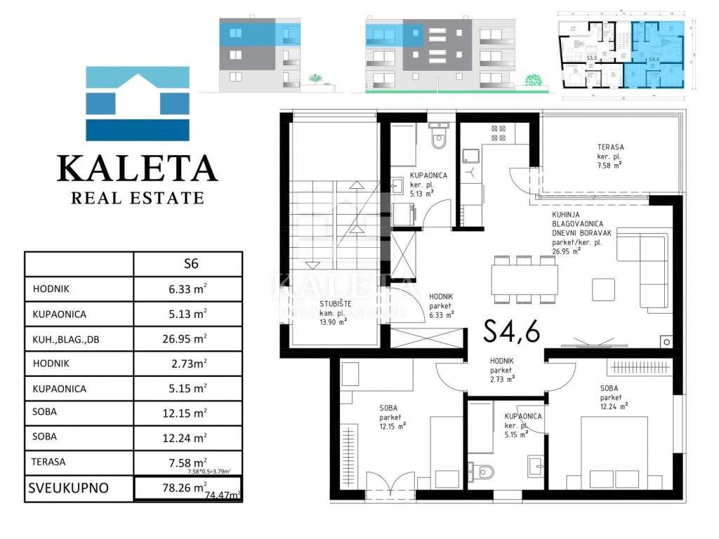 Novogradnja ukupne prodajne površine od 74,47 m² neto + 1 parkirno mjesto u cijeni nalazi se na drugom katu zgrade s ukupno 6 stanova.