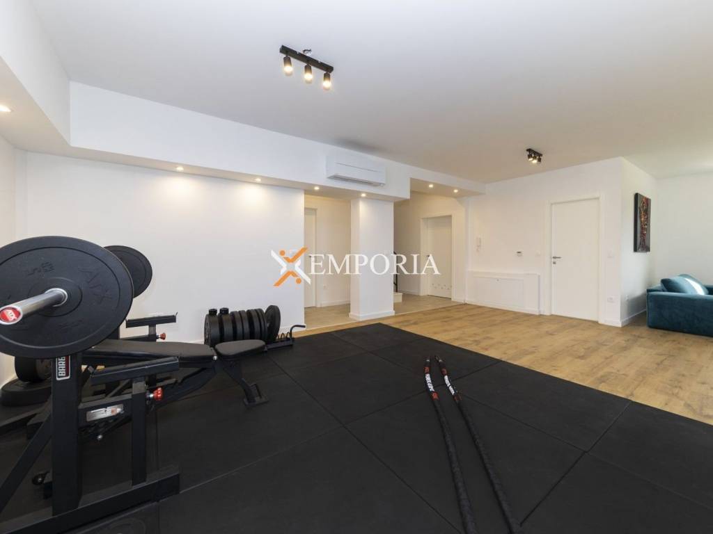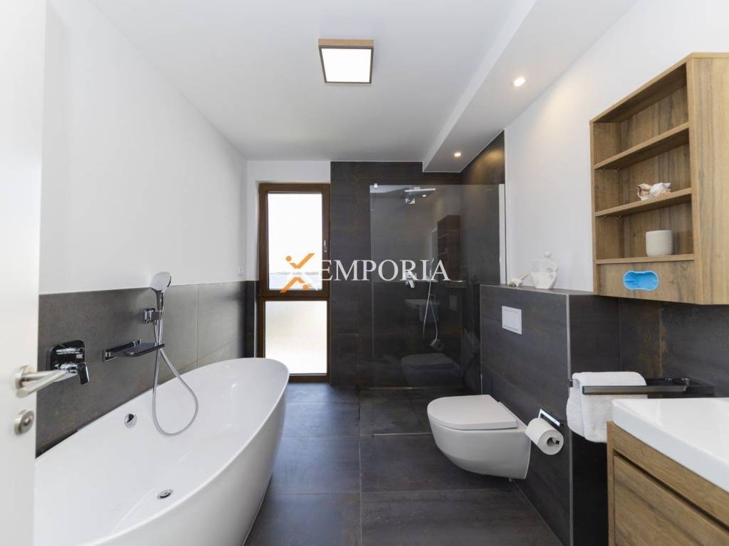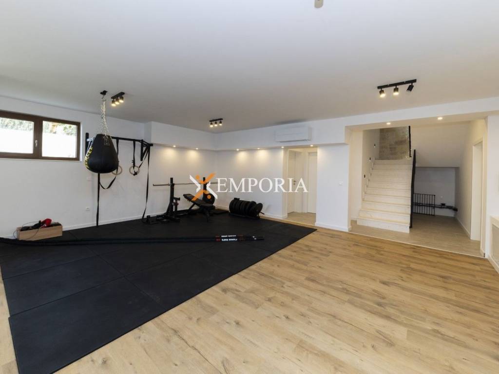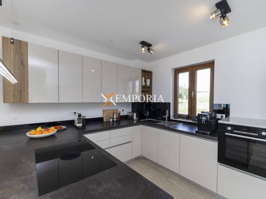 Sav postojeći namještaj je uključen u cijenu.Godina izgradnje je 2022. Gradnja kuće izvršena je ciglenim termo blokom i kamenom oblogom. Toplinska izolacija fasade izvedena je s 5 cm Styrodur-a. Prozori su od PVC materijala s električnim roletama, troslojnim staklom i komarnicima. Podne obloge su parket i pločice. U cijeloj kući je električno podno grijanje putem dizalica topline. Sve sobe su klimatizirane. Osim toga, u kući se također nalazi kamin.Nadalje, navodnjavanje vrta je automatsko.Kuća također ima video interkom sustav i video nadzor.