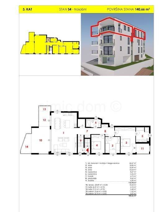 Posredujemo u prodaji uistinu prekrasne i prostrane nekretnine na iznimno atraktivnoj lokaciji u Tučepima. Riječ je o stanu na trećem katu manje zgrade koja je upravo u izgradnji te se završetak očekuje do ljeta iduće godine. Površina stana je 140,66 m2 te nudi hodnik, predsoblje, tri spavaće sobe, dvije kupaonice te veliki dnevni boravak s kuhinjom i blagovaonicom. Posebno ističemo impresivne vanjske prostore stana: terasu, dvije loggie te dva balkona, a s kojih se ruža predivan pogled ili na more i otoke ili na Biokovo. Pored vrlo visoke razine izgradnje, zgradu će krasiti i vrhunski izbor finalne opreme: klimatizacijski uređaji u svim sobama, podno grijanje u lijepo opremljenim kupaonicama, sanitarije i keramika u skladu s modernim dizajnom Uz stan je nužno kupiti i vanjsko parkirno mjesto za 10.000 te ostavu od 2.000/m2. More i poznate plaže su udaljene otprilike 500m, a u neposrednoj su blizini i svi nužni sadržaji. Riječ je o izvrsnoj prilici za kupnju visoke isplativosti. Vlasništvo uredno.