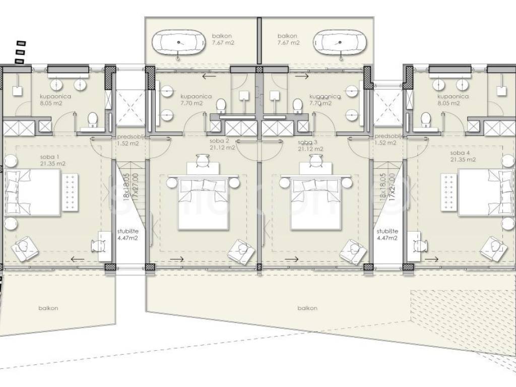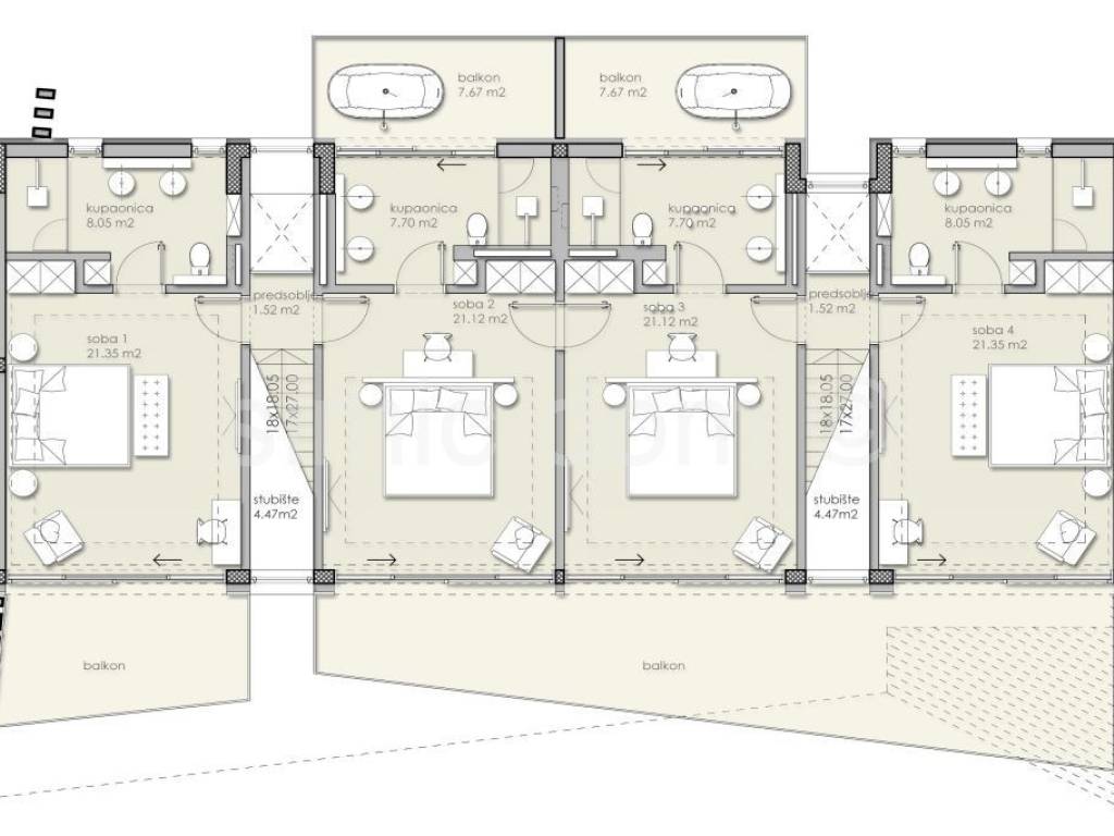 Posredujemo u prodaji vrhunske tri vile u sklopu novog projekta na području Kaštelira u Istri. Svaka od vila biti će sagrađena na zemljištu od 1000m2 što omogućava kupcu privatnost i prostranost. Vile će biti savršen spoj stila i funkcionalnosti te će se idealno uklapati u prirodno okruženje. Moderne linije i oblici elegantno se stapaju s prirodom, stvarajući skladan spoj tradicije i inovacije. Svaka od vila ima preko 300m2 neto korisne površine, odnosno oko 250m2 unutarnjeg prostora i preko 270m2 podne površine vanjskog prostora koji čini mnoštvo terasa sa vrhunskim pogledom, veliki 'infinity' bazen od preko 50m2, jacuzzi te predivno osmišljen kamin otvorenog koncepta sa prostorom za sjedenje. U sklopu velikog vanjskog prostora je i popločan prilaz te parking za 4 automobila. Sama vila proteže se preko dvije etaže. U prizemlju je zamišljen dnevni dio sa velikim dnevnim boravkom, kuhinjom i blagovaonicom, a tu je i spremište te sauna i dva wc-a. Gornji kat će imati ukupno četiri spavaće sobe, svaka sa vlastitom kupaonicom. Velike staklene stijene na svim etažama omogućuju bogatu prirodnu svjetlost i izlaz na predivne terase sa spektakularnim pogledom na more. Vile će biti vrhunski opremljene kamerama, žaluzinama na senzor, alu-stolarijom, podnim grijanjem, solarnim napajanjem, punjačem za električna vozila, automatskim navodnjavanjem okućnice i još brojnim karakteristikama. Ova raskošna nekretnina smještena u zapadnom dijelu Istre idealna je nekretnina koja nudi istovremeno luksuz i opuštanje. Cijena od 1.950.000 predstavlja cijenu s uključenim PDV-om, no ukoliko kupac kupuje nekretninu na firmu cijena iznosi 1.560.000. Blizina vinarija, renomiranih restorana i proizvođača maslinovog ulja osigurava budućim vlasnicima uživanje u ljepotama same vile i prirod, te u vrhunskim gastronomskim i enološkim doživljajima ovog područja. Završetak radova očekuje se krajem 2026. godine.