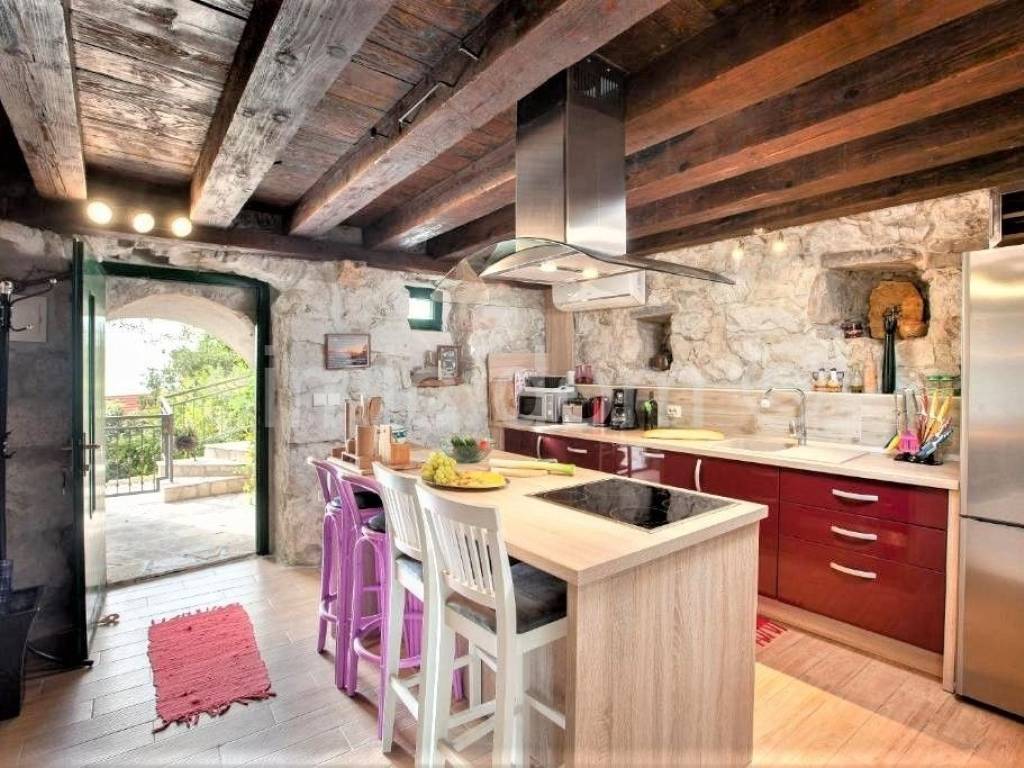 Posredujemo u prodaji uistinu jedinstvene nekretnine, stare kamene kuće koja je potpuno renovirana kako bi nudila sav moderan komfor uz mnoštvo tradicijskih detalja koji odražavaju duh lokaliteta. Površina vile je 150m2 te se prostire na tri etaže: prizemlje, prvi i drugi kat. U prizemlju se nalazi manja ostava, dodatan wc, kuhinja te blagovaonica. Iz ovog se dijela izlazi na prekrasnu terasu s roštiljem i manjom kućicom koja trenutno služi kao spremište alata. Gornji katovi kuće nude divan dnevni boravak, dvije spavaće sobe te dvije kupaonice. S drugog se kata pristupa na bazen s prostorom za sunčanje i krovnu terasu koja nudi upravo nevjerojatan pogled na more, otoke i Biokovo. Lokacija kuće je jako mirna, a tu je i parkirni prostor. S obzirom na jedinstvenu kombinaciju modernog komfora, kamena i tradicije, kuća je idealna za višemjesečni najam, ali i kao mirna obiteljska oaza. Prodaje se potpuno namještena i opremljena vrhunskim uređajima. Vlasništvo uredno.