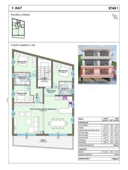 Posredujemo u prodaji vrlo prostranog, šarmantnog i osunčanog stana u novogradnji koja je udaljena nekoliko minuta šetnje od najljepših plaža Makarske Rivijere. Površina mu je 114,6m2, a sastoji se od tri spavaće sobe, dvije kupaonice, ulaznog prostora, hodnika te vrlo velikog dnevnog prostora s kuhinjom i blagovaonicom. Upravo se iz tog dijela izlazi na balkon koji nudi jako lijep pogled na more, planine i okolno područje. Riječ je o manjoj, kvalitetno građenoj zgradi, koja će po završetku imati podno grijanje u kupaonici, keramiku i sanitarije prve klase, električne podizače roleta, smart home uređaje (klima, detektori topline), vrhunska protuprovalna vrata, itd. Uz nadoplatu je moguće osigurati vanjsko parkirno, garažno mjesto i ostavu. S obzirom na lokaciju u blizini mora, plaže i nužnih sadržaja, ovo je idealna lokacija za iznajmljivanje ili miran odmor. Vlasništvo uredno.