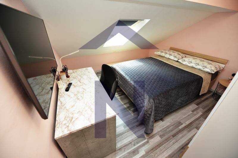 The interior staircase leads to the second floor of the apartment (attic) which consists of: a lobby, two bedrooms with standard double beds, wardrobe cabinets, smart-tv and two auxiliary rooms which are closed, andby opening them one large room can be obtained.