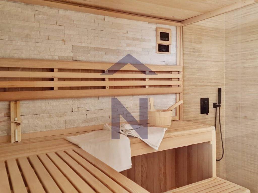 The ground floor consists of the living area with kitchen and dining room, sauna, storage, bathroom and a terrace with the pool view and the sunbathing area.