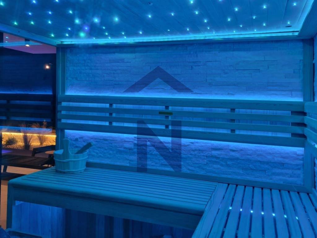 Die Abmessungen des Pools sind 9x3,5m, und eine Seite des Pools ist komplett aus Glas gemacht. Es gibt einen attraktiven 1,5m breiten Wasserfall in der Nähe der Liegewiese, der in den Pool fließt. Dieser Teil der Villa ist ideal zum Entspannen und Genießen.