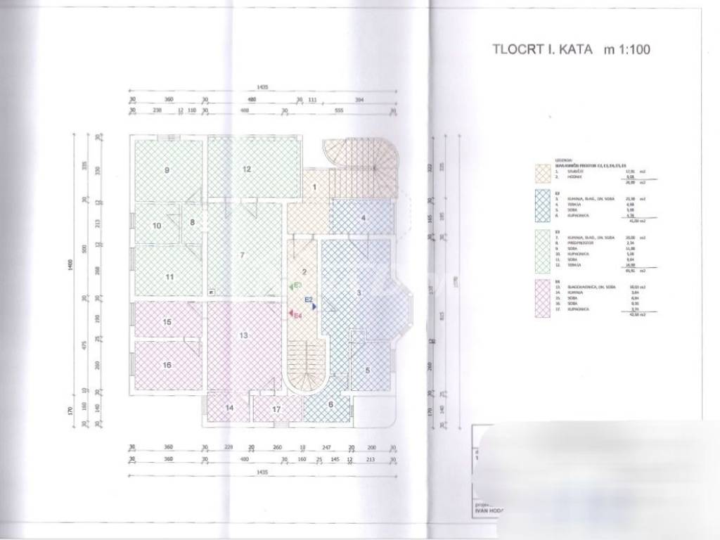 Etažno vlasništvo E1 sastoji se od ulaza hodnika, kupaonice, wc, kuhinje, dvije ostave, blagovaonice s dnevnim boravkom, dvije terase, četiri spavaće sobe, ukupne korisne površine etažne jedinice iznosi 168.23 m2. Pripada mu i dva parkirna mjesta. Cijena apartmana E1 iznosi 504 690,00
