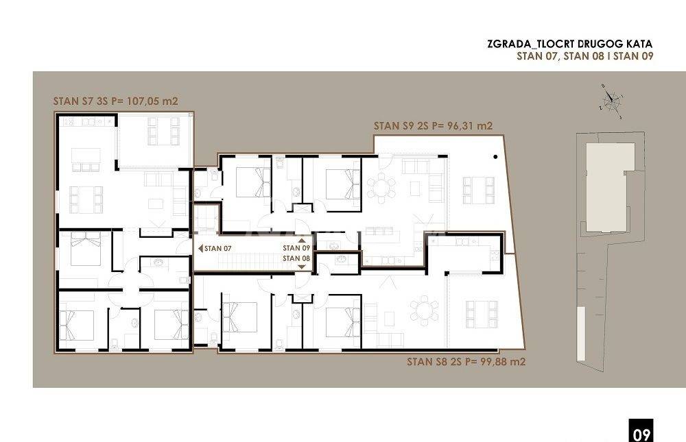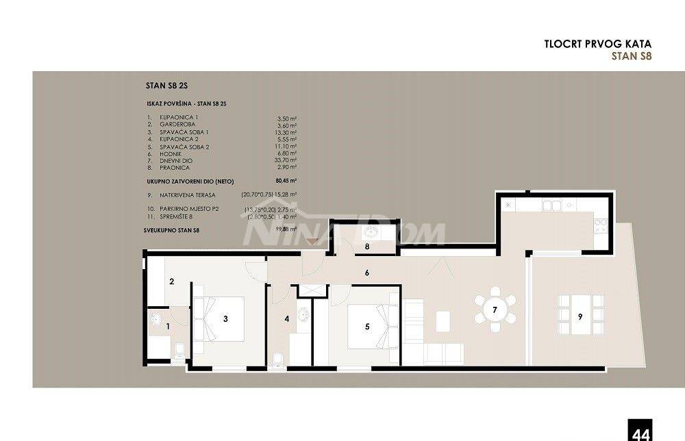Apartman S8 smještena je na drugom katu i sastoji se od hodnika,dvije kupaone, dvije spavaće sobe, kuhinje s dnevnim boravkom, cw, natkrivenom terasom, ostava (spremište br,8) 2.80 m2.