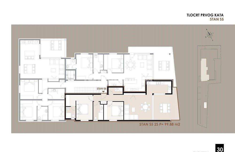 Apartman S5 smješten jna prvom katu i sastoji se od hodnika,dvije kupaone, dvije spavaće sobe, kuhinje s dnevnim boravkom, wc, natkrivenom terasom, ostava (spremište br,3) 2.20 m2.