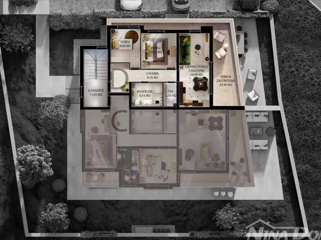 Sastoji se od : ulaza , hodnika , dvije spavaće sobe , kupaonice , spremišta , open space kuhinje s dnevnim boravkom iz koje se izlazi na prostranu terasu.