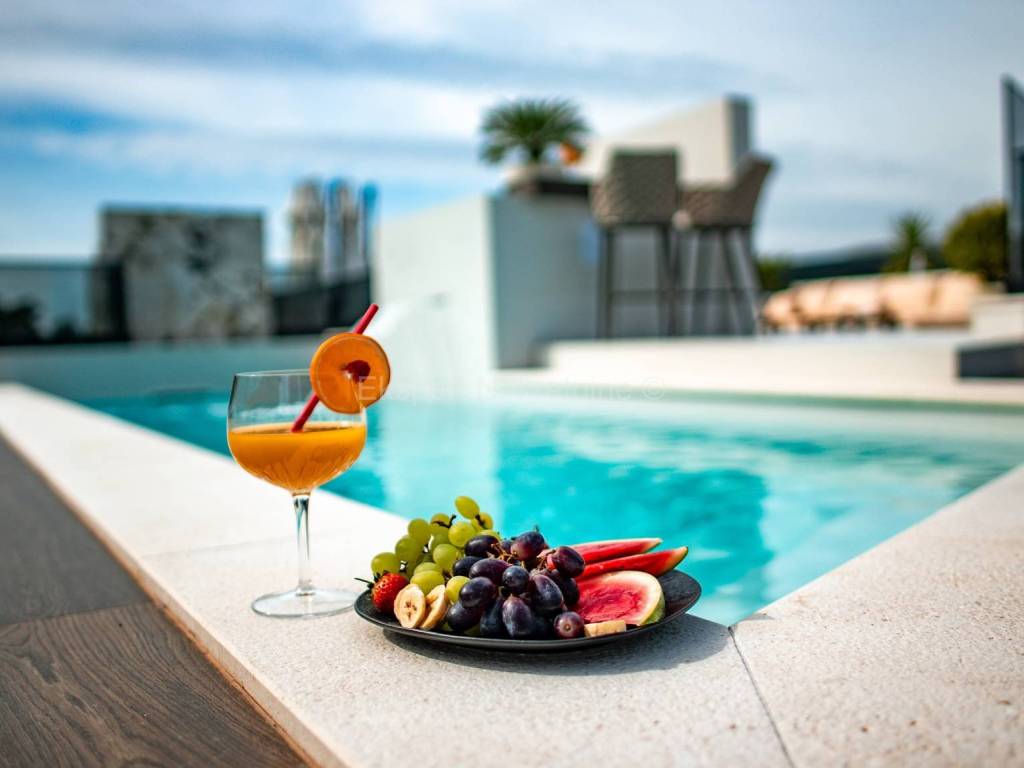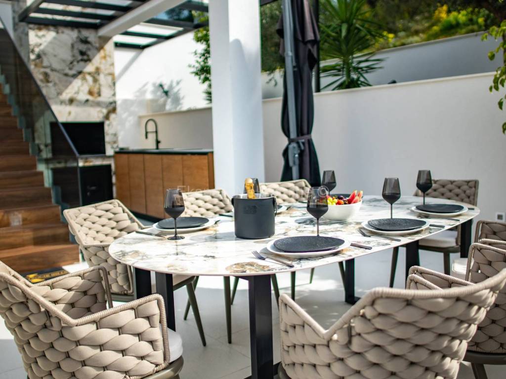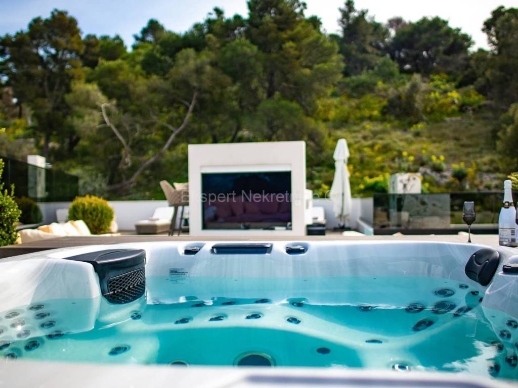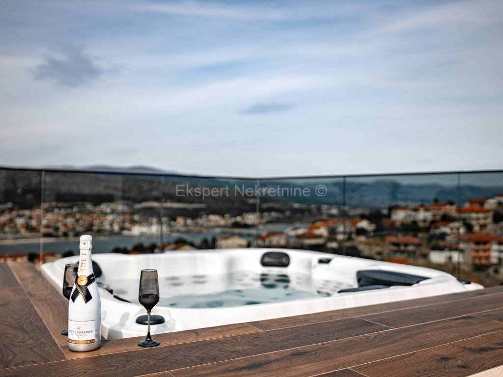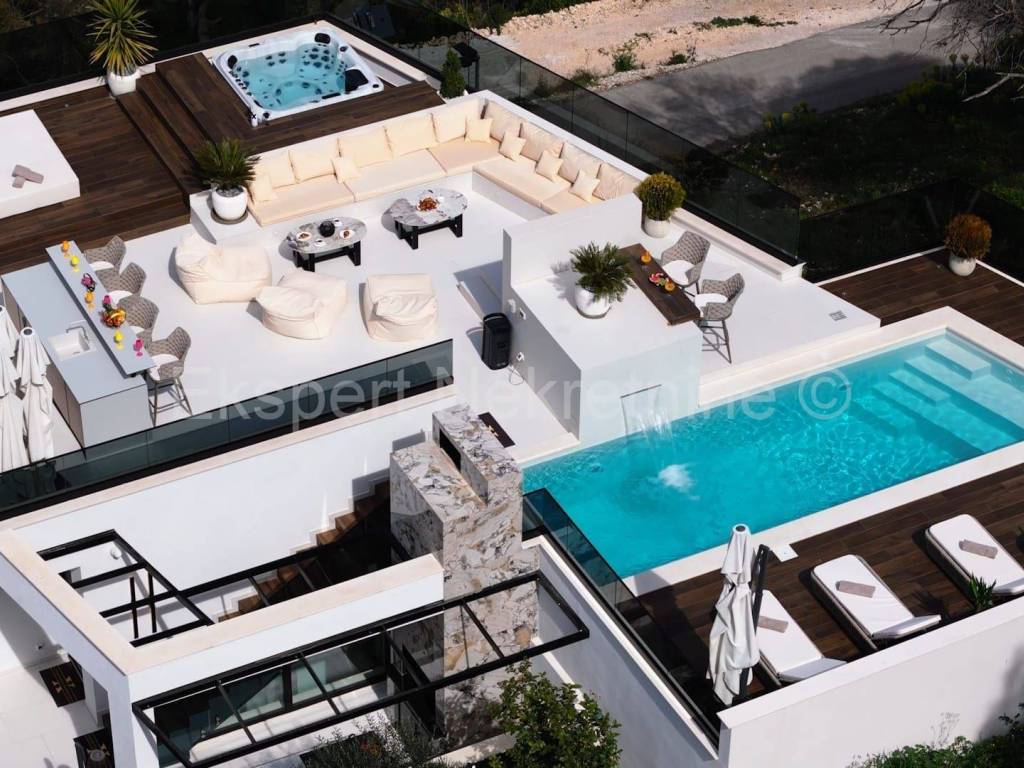 Villa ima i veliku krovnu terasu na kojoj se nalazi veliki vanjski dnevni boravak,sa mini barom i šankom,povišeni dio sa deckingom i madracima oko jaccuzija,povišeni lounge uz bazen,te preljevni bazen sa slanom vodom te žardinjere sa zelenilom.Cijela terasa je ograđena toniranom staklenom ogradom koja pruža privatnost a istovremeno imate pogled sa cijele terase na more i grad Trogir.