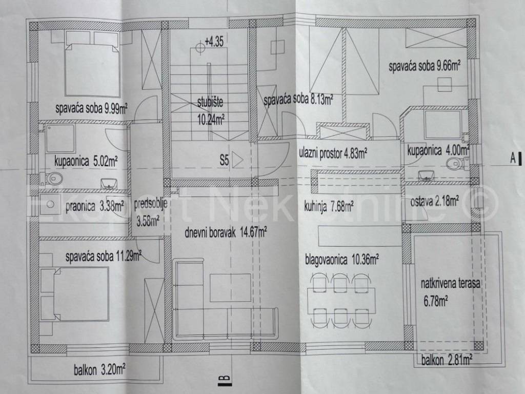 Stan se nalazi na drugom (zadnjem) katu zgrade,sjever-jug-istok-zapad je orijentiran a sastoji se od 4 spavaće sobe od čega jedna sa vlastitim balkonom,dva kupatila,praonice,ostave,hodnika,kuhinje sa blagovaonicom i velikog dnevnog boravka,te velikog balkona(10m2).