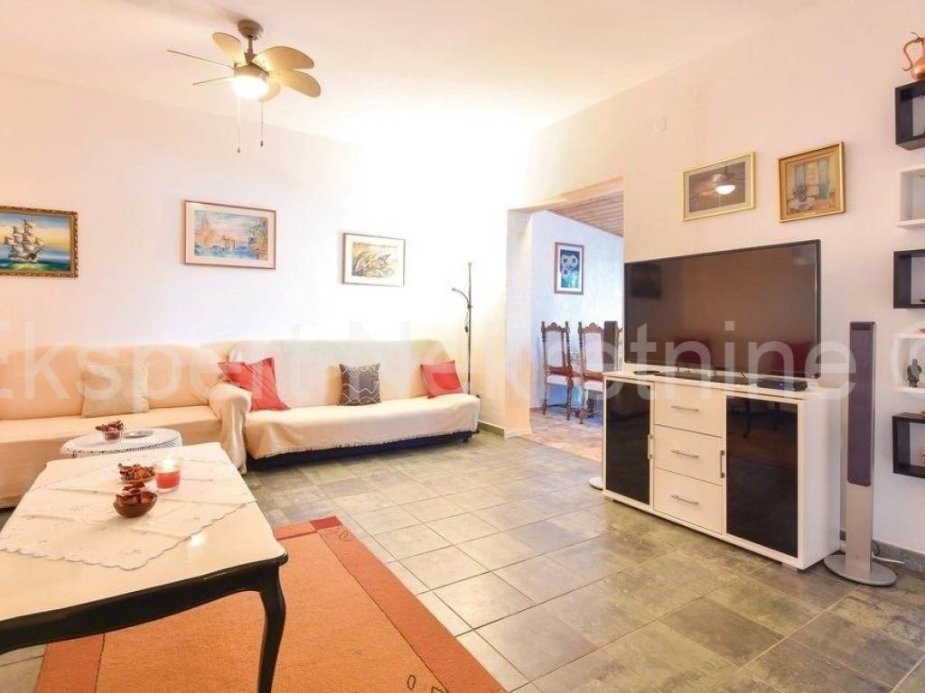 Na prvom katu smješten je komforni dnevni prostor, kuhinja i blagovaonica te izlaz na veliku terasu sa sjenicom i kaminom te s pogledom na more. Tu su još mala ostava, dvije sobe i dvije kupaonice.