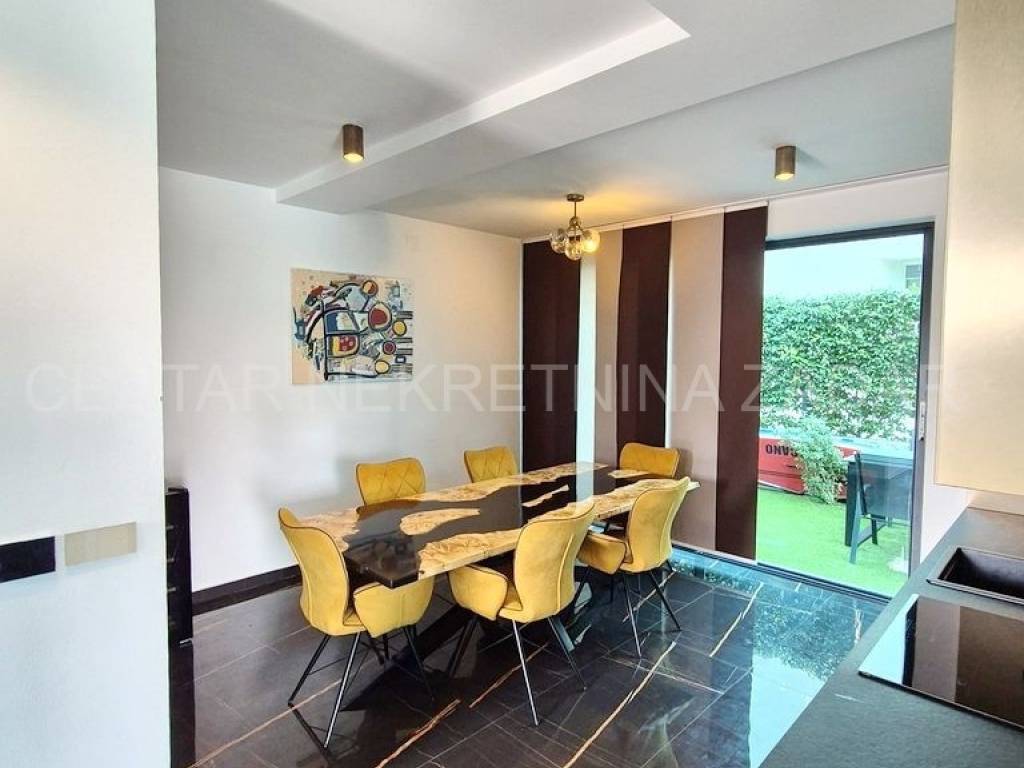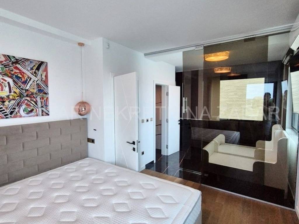 Apartman je potpuno namješten i moderno opremljen. U cijelom prostoru provedeno je podno grijanje, u dnevnom boravku i spavaćim sobama su klima uređaji, a u dnevnom boravku je i dimnjak. Ugrađena je aluminijska stolarija s komarnicima i električnim podizačima roleta. Apartmanu pripadaju dva parkirna mjesta u dvorištu zaštićenom rampom, a ima i vlastitu punionicu za električno vozilo.