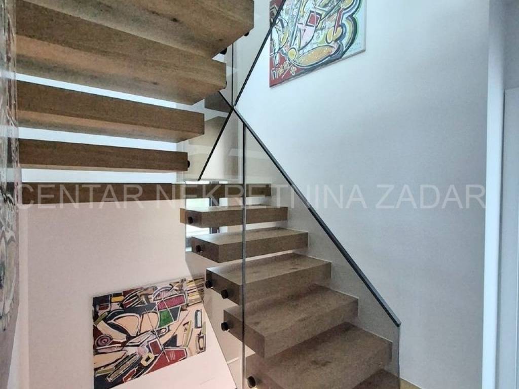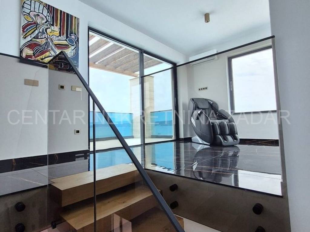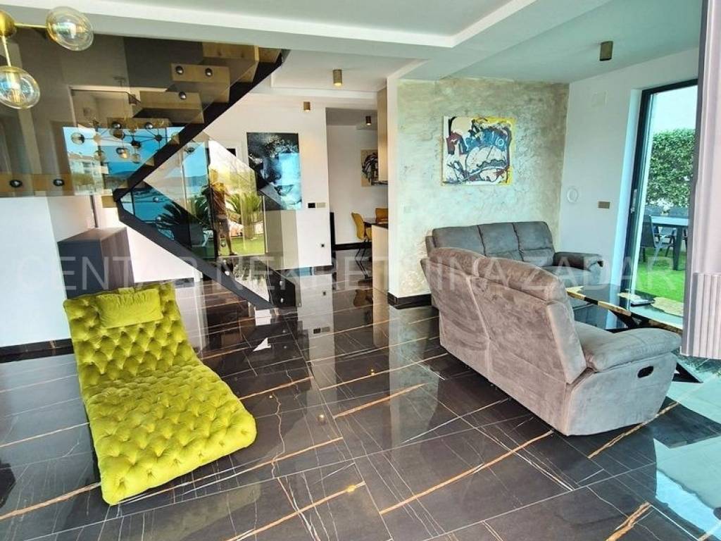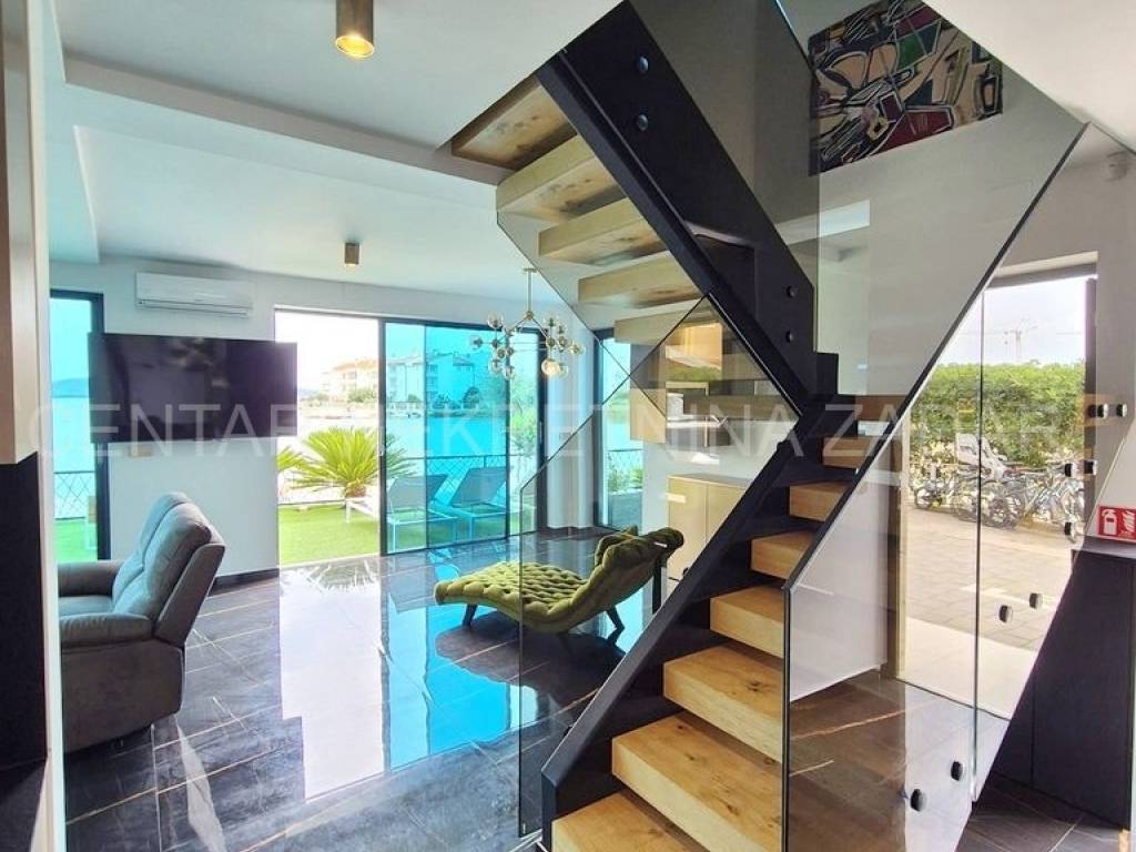 Stambena površina od 169,50 m raspoređena je na tri etaže povezane unutarnjim stepeništem. U prizemlju su ulazni hodnik, kupaonica (5,9 m), kuhinja s blagovaonom (18,4 m) i dnevni boravak (27,4 m) koji izlazi u pripadajući vrt od 114 m. Velike staklene stijene omogućuju uživanje u pogledu na more i otoke i iz samog apartmana. Na prvom katu su hodnik, kupaonica te tri spavaće sobe (14.3, 9,9 i 9,2 m) od kojih najveća ima vlastitu kupaonicu i toalet. Na drugom katu su hodnik, još jedna soba, WC, prostor za odmor te terasa od 20,7 m s koje se pruža neometani pogled na more.