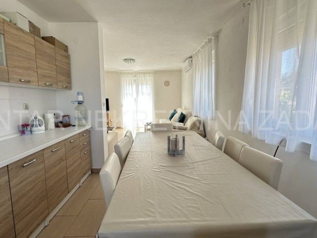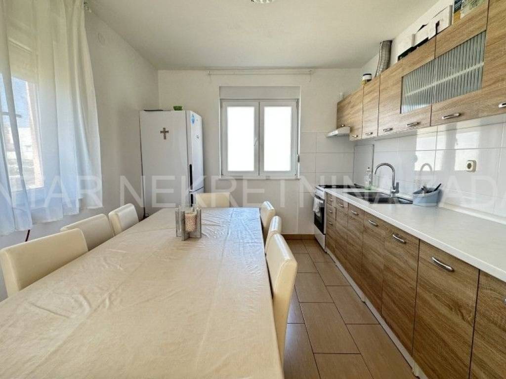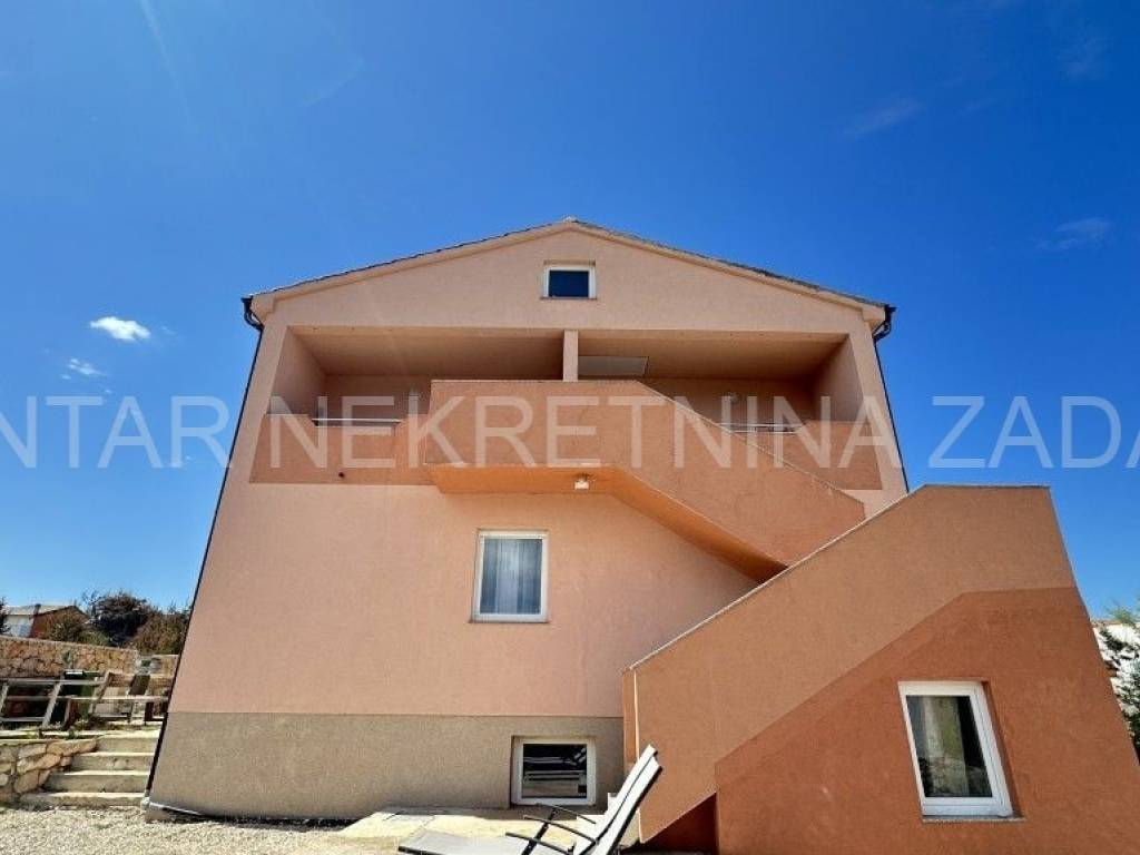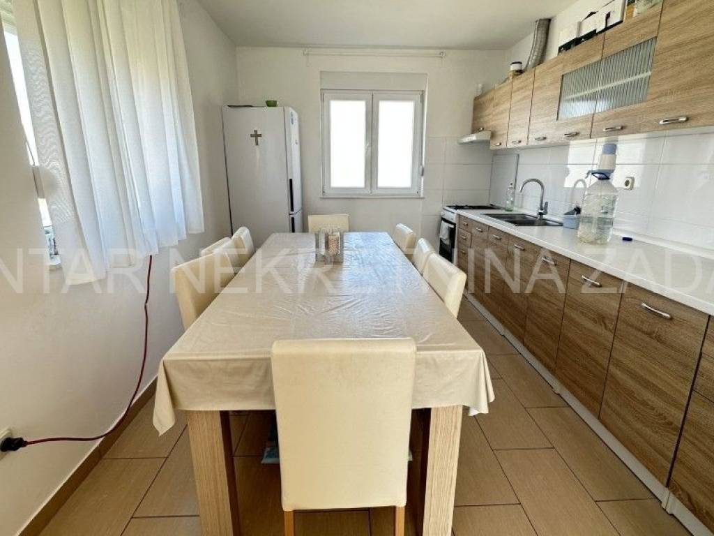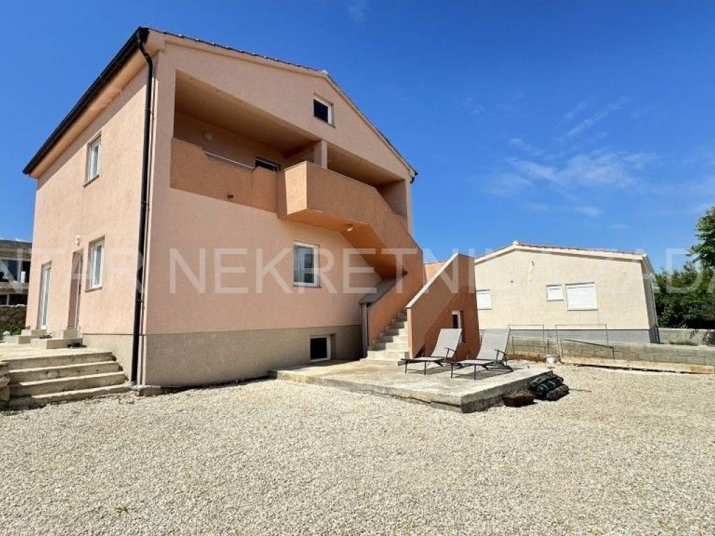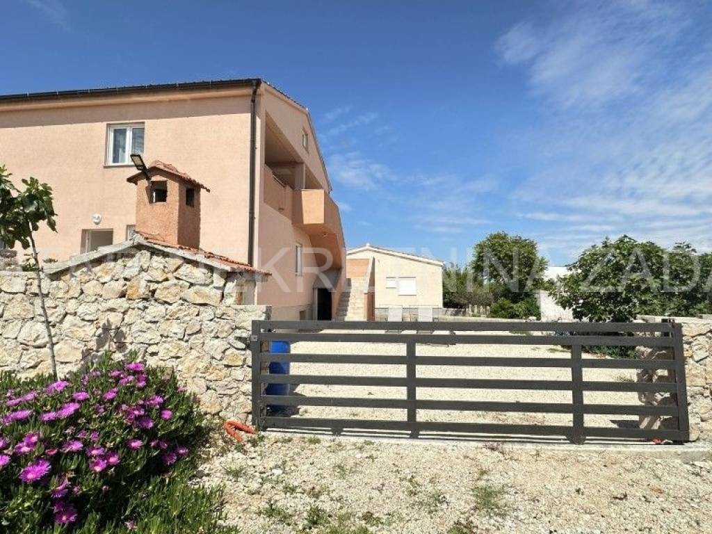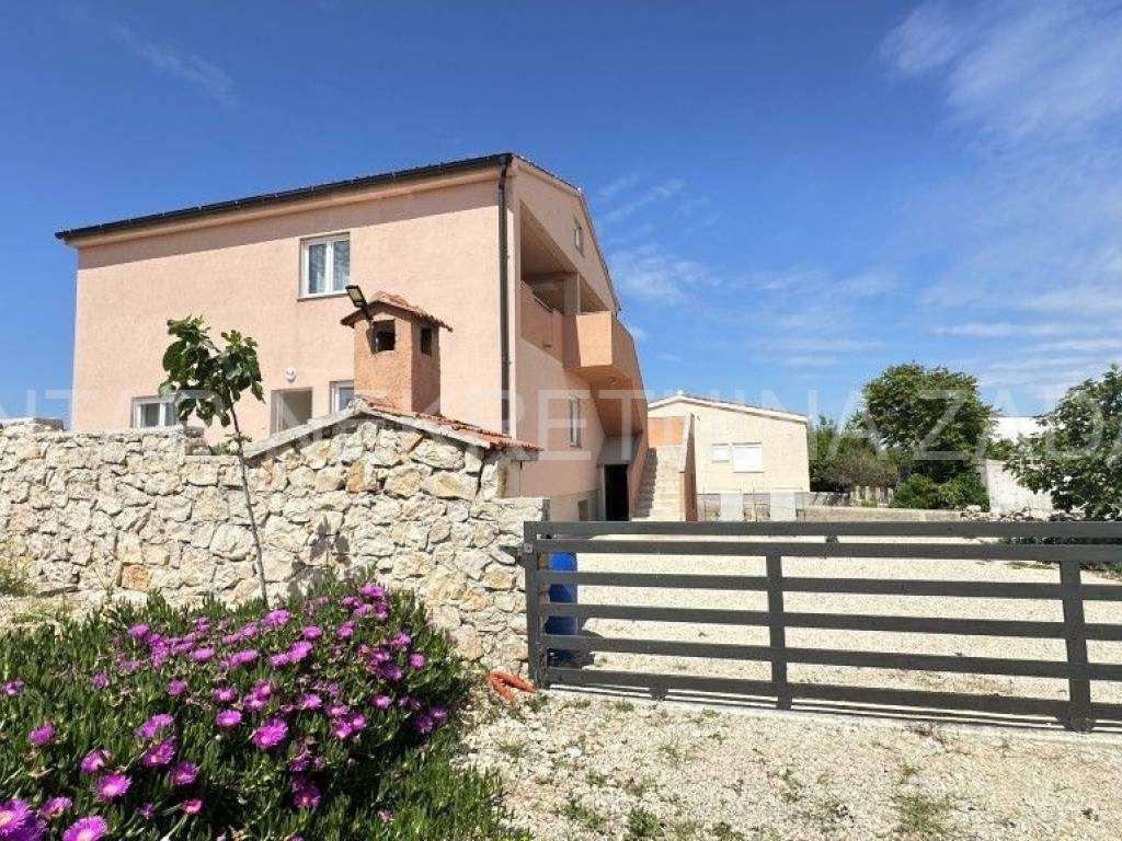 Prodaje se uređena kuća u Ražancu, 600 m udaljena od mora, a 850 m udaljena od plaže. Kuća površine 214 m2 smještena je na zemljištu veličine 437 m2, a sastoji se od prizemlja i kata. U prizemlju je smješten trosoban stan koji se sastoji od hodnika, tri spavaće sobe, kupaonice, toaleta i kuhinje s blagovaonicom i dnevnim boravkom s izlazom na dvorište. Na katu su smještena dva kategorizirana jednosobna apartmana s pogledom na more. Svaki apartman ima vlastiti ulaz i vlastitu lođu, a sastoji se od kuhinje s blagovaonicom, kupaonice i spavaće sobe. Početak gradnje započet je 2013.godine, a kuća je završena 2017.godine kada je napravljena fasada. Stolarija je PVC s roletnama. Svaki stan je klimatiziran, a grijanje je moguće i na dimnjak. Prodaje se namještena, bez potreba za dodatnim unutarnjim uređenjem. Okućnica je prostrana, s parkingom i gusternom za vodu, uređena s nekoliko mediteranskih biljaka. Za dodatne informacije, kontaktirajte nas na 091 607 0340.