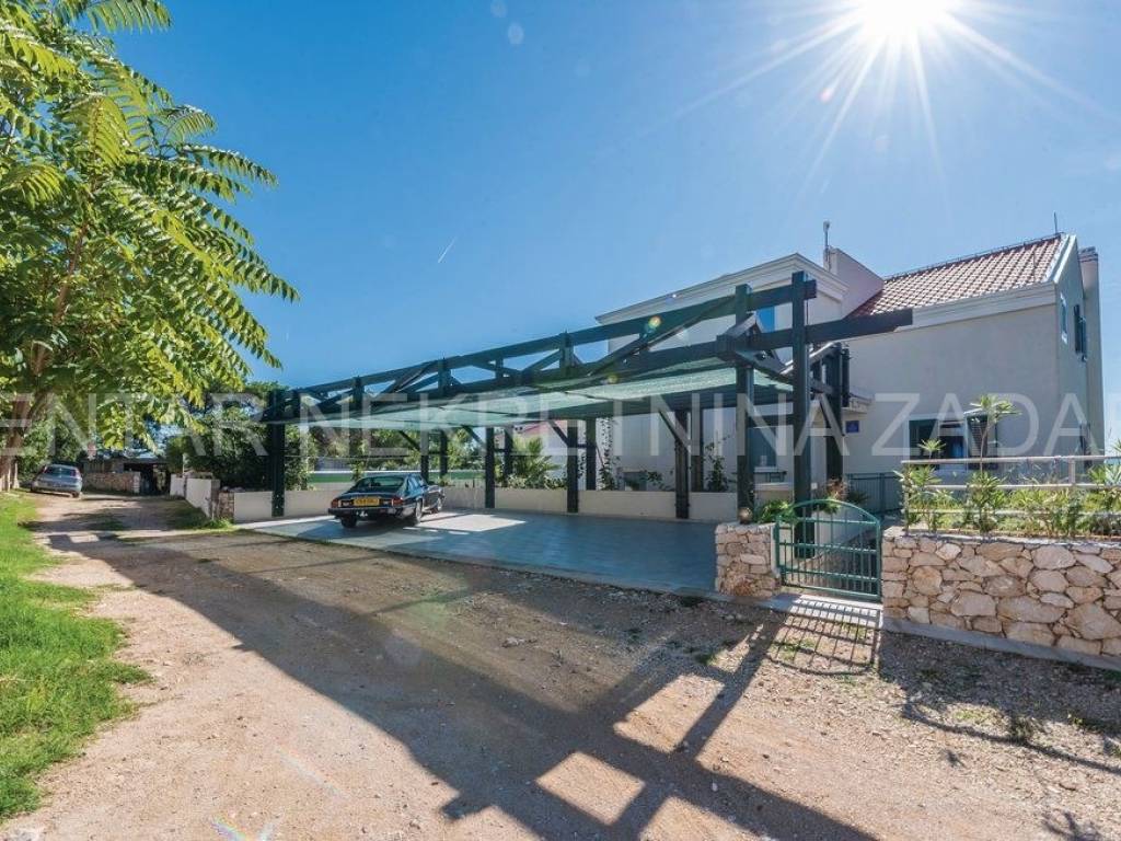 Uz kuću je ljetna kuhinja s toaletom i prostorom za zabavu od 70 m (biljar, pikado, stolni nogomet). Pred kućom je bazen od 49 m i vanjski tuš. Uz kuću su četiri natkrivena parkirna mjesta. Parcela od 520 m ograđena je kamenim zidom, a dvorište popločano kamenom i uređeno raznovrsnim mediteranskim biljem i palmama.