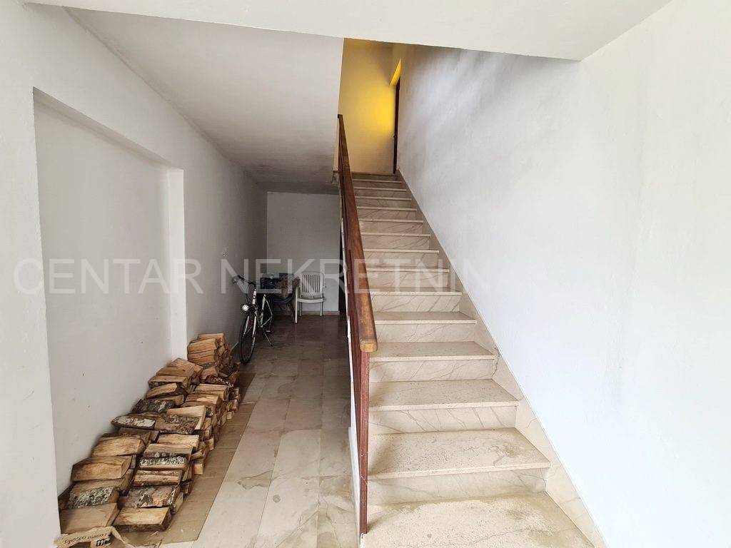 U prizemlju je garaža od 23 m povezana sa spremištem od 16 m te radionica od 26,6 m koja može služiti kao druga garaža. Iza nje su dva manja spremišta i radna soba.