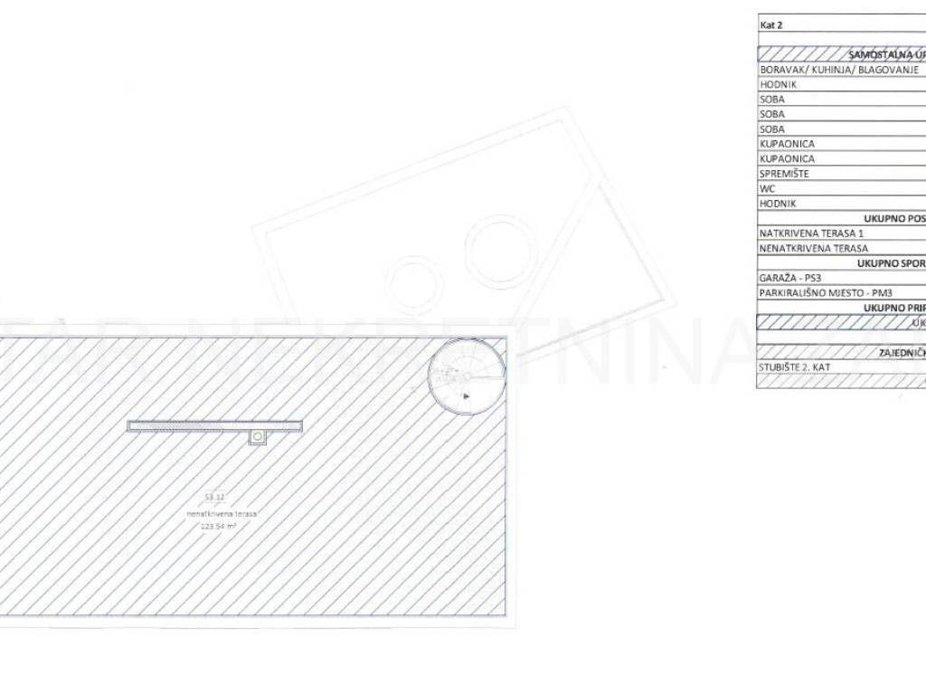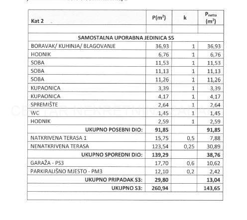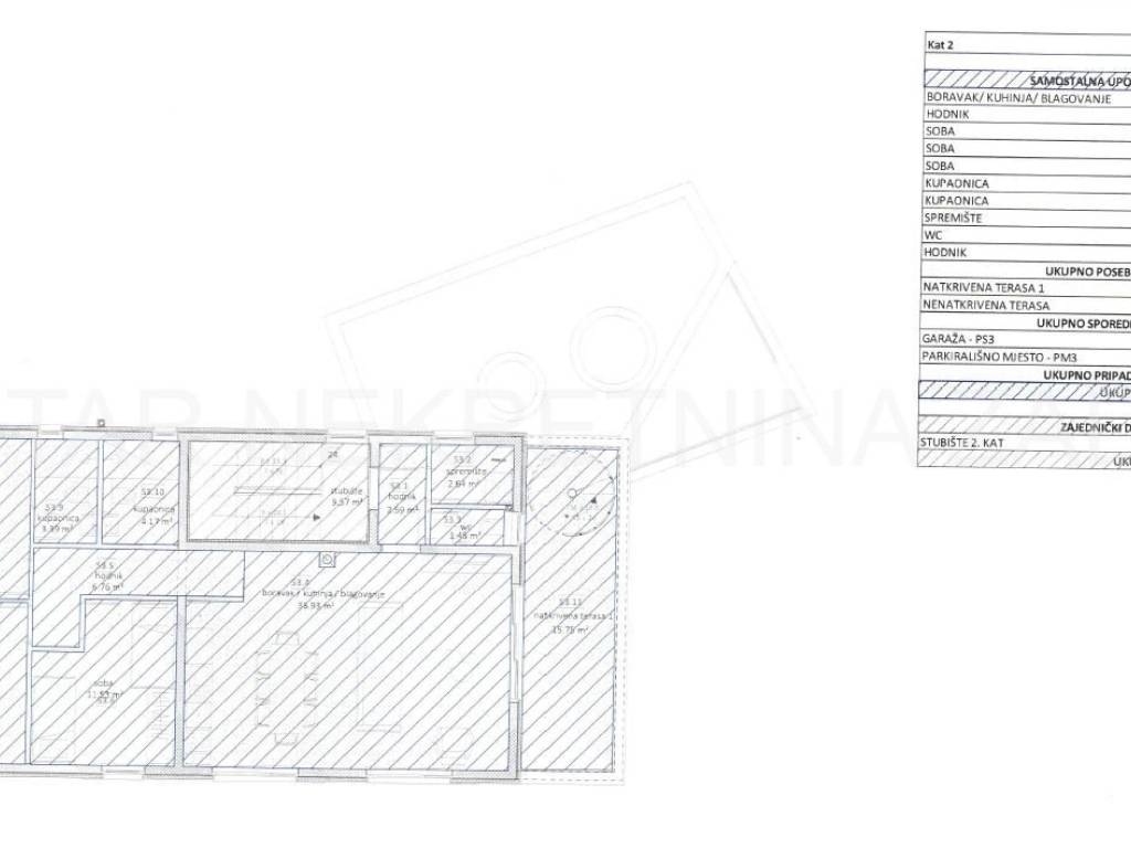 Površina mu je 91,85 m i sastoji se od kuhinje s blagovaonom i dnevnim boravkom (40 m), tri spavaće sobe (svaka od oko 11 m), hodnika, dviju kupaonica, toaleta, predsoblja i spremišta. Jedna od soba ima svoju kupaonicu. Dnevni boravak je velikom staklenom stijenom odijeljen od južno orijentirane natkrivene terase površine 15,75 m s koje se pruža pogled na more. S terase spiralne stepenice vode na krovnu terasu od 123,5 m s panoramskim pogledom na more. Stanu još pripada prostrana garaža (17,7 m) i jedno parkirno mjesto pa ukupna neto korisna površina stana iznosi 143,65 m.
