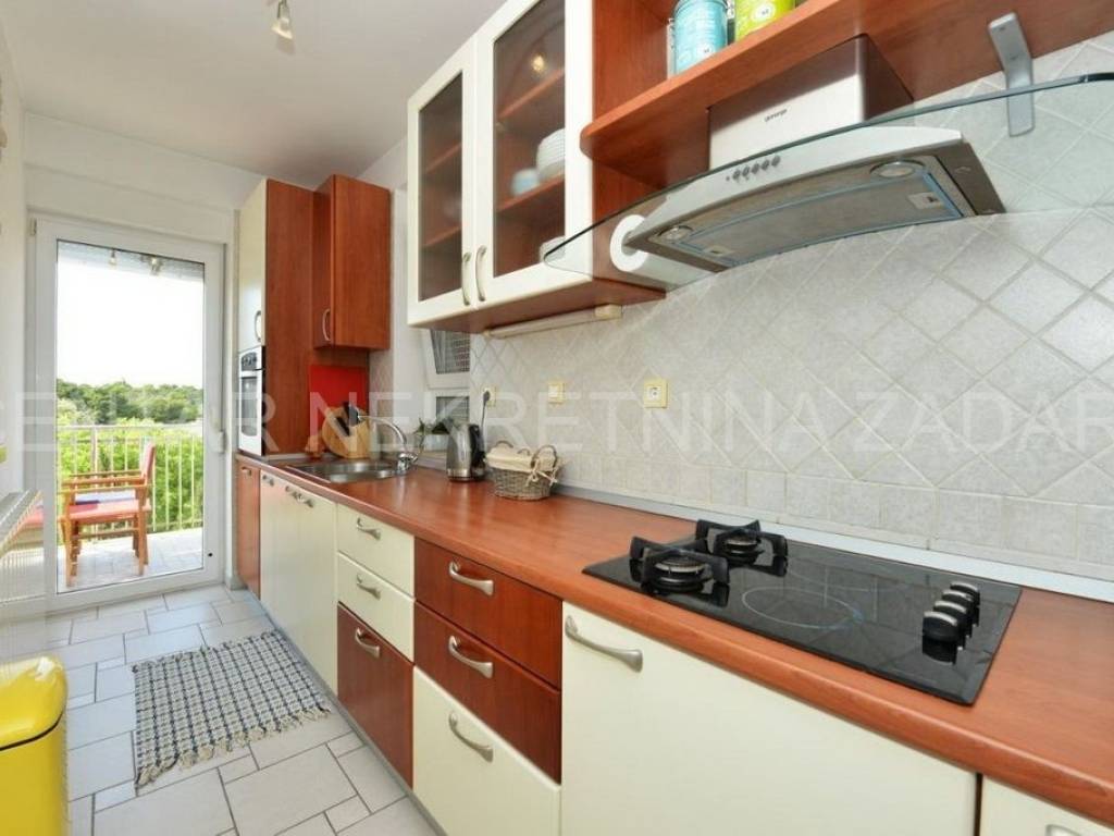 Na donjoj etaži nalaze se hodnik, dnevni boravak s blagovaonom (26,26 m), kuhinja (7,37 m), dvije spavaće sobe i kupaonica s tuš kabinom. Dnevni boravak i kuhinja imaju izlaz na balkon zapadne orijentacije od oko 9 m s pogledom na grad i Velebit. Balkon je tendom zaštićen od sunca pa je ugodan za cjelodnevni boravak. Na gornjoj etaži su hodnik, prostrana spavaća soba i kupaonica u kojoj su kutna jacuzzi kada i tuš kabina. Iz sobe se pruža pogled na južni dio grada, more i otoke.