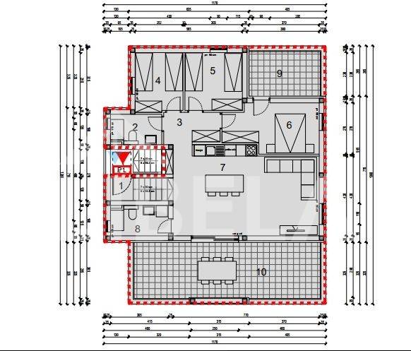 Sastoji se odtri spavaće sobe, kupaonice, kuhinje, blagovaonice i dnevnog boravka te dvije prostrane lođe površine20,18 i 17,84 m2.