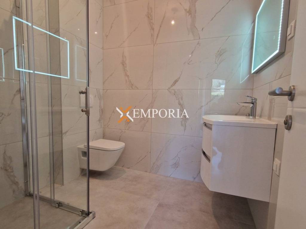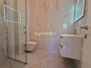 Zgrada je građena betonskim zidom. Fasada je termoizolirana stiroporom debljine 10 cm. Podne obloge su pločice. Prozori su PVC, s aluminijskim staklenim stijenkama, električnim roletama, moskitnim mrežama i troslojnim staklom. Postavljeni su klima uređaji u dnevnom boravku i svim sobama.Apartman je opremljen podnim električnim grijanjem u svim prostorijama. Nadalje, ulazna vrata stana su protuprovalna i protupožarna.Ova nekretnina posjeduje izvrstan energetski certifikat A+!