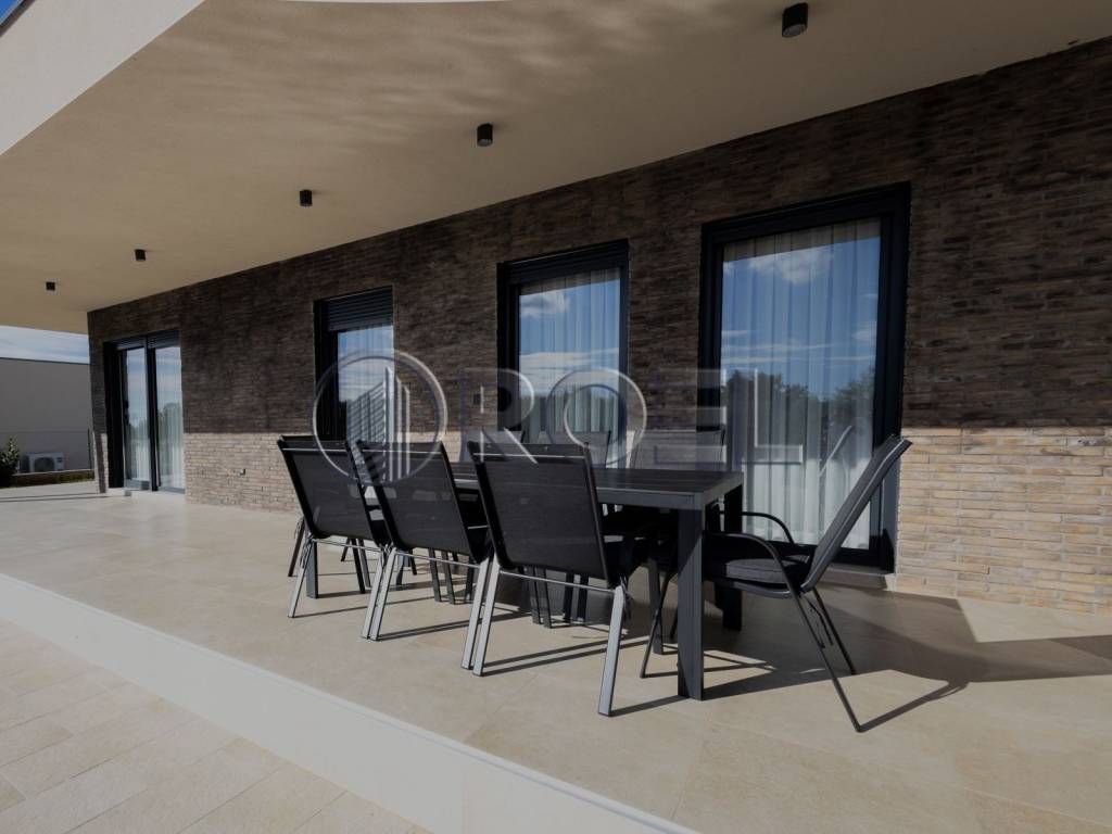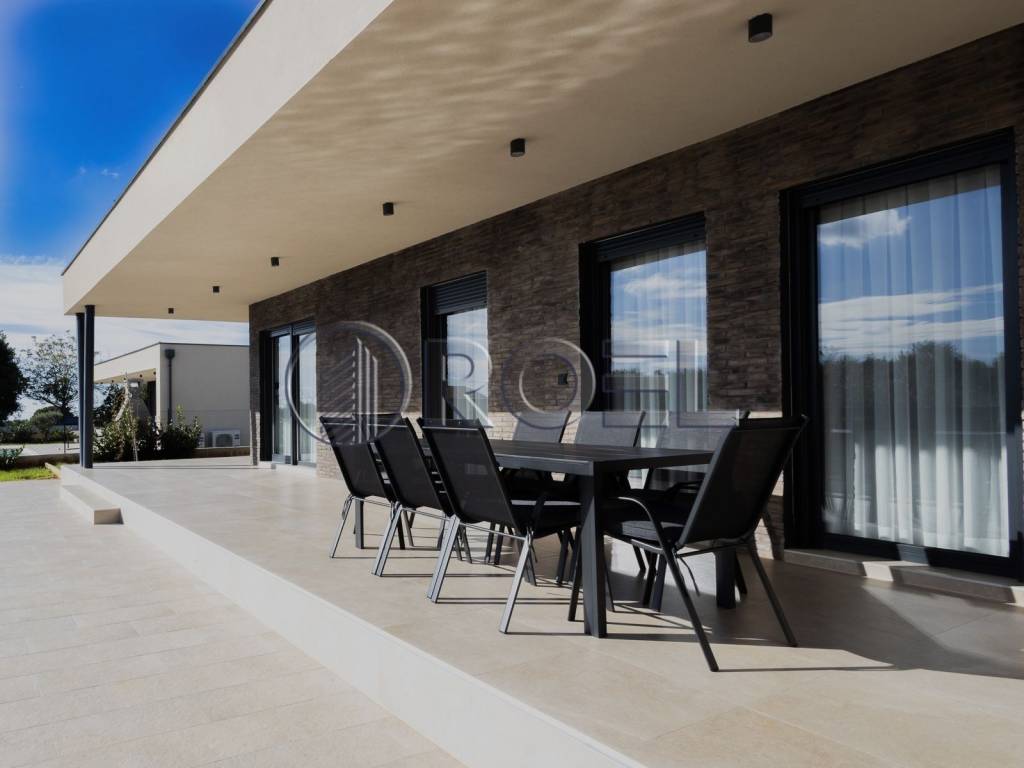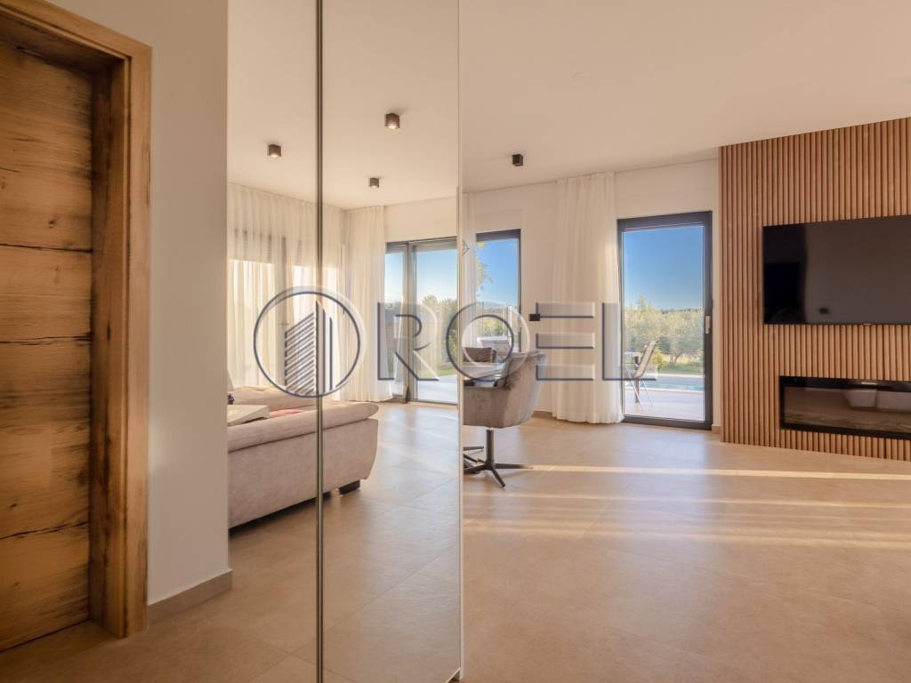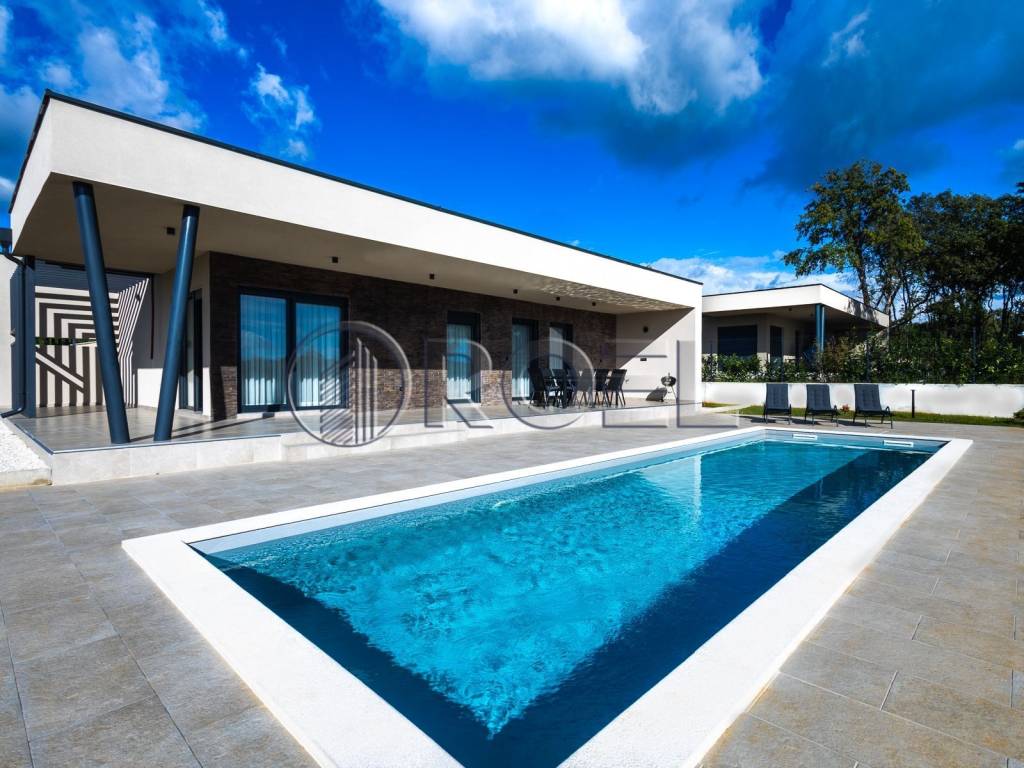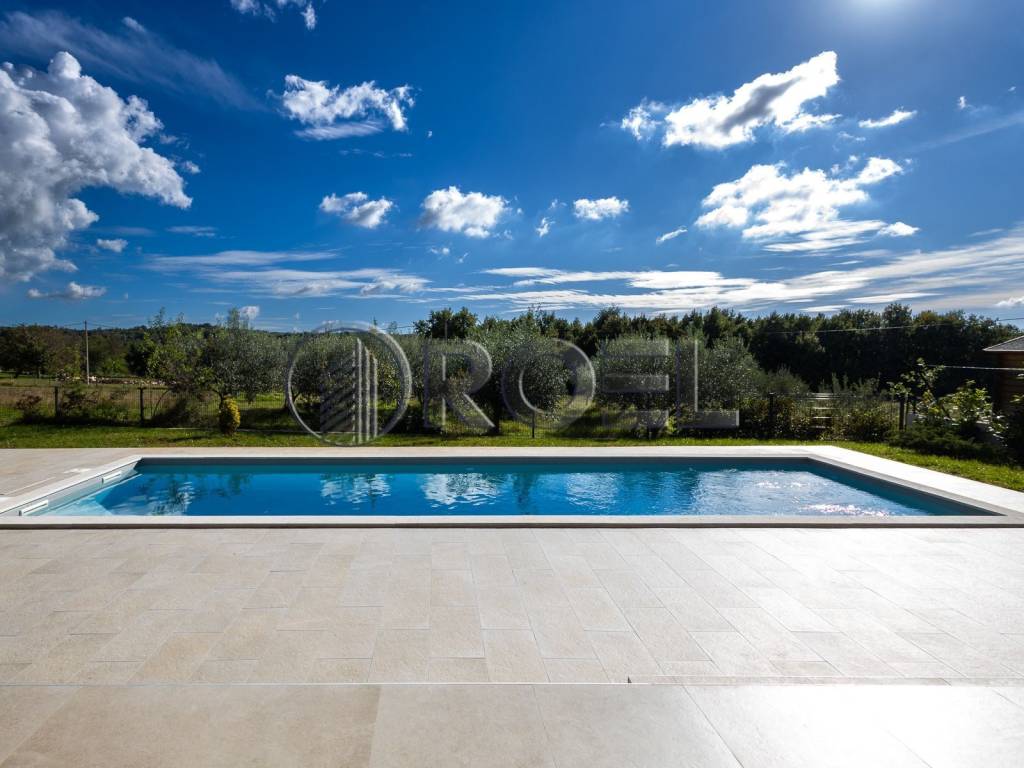 U mirnom naselju Jakovici, u Općini Tinjan, svega 15 kilometara od mora i plaža Poreča, prodaje se moderna luksuzna kuća s bazenom, potpuno nova i spremna za useljenje.