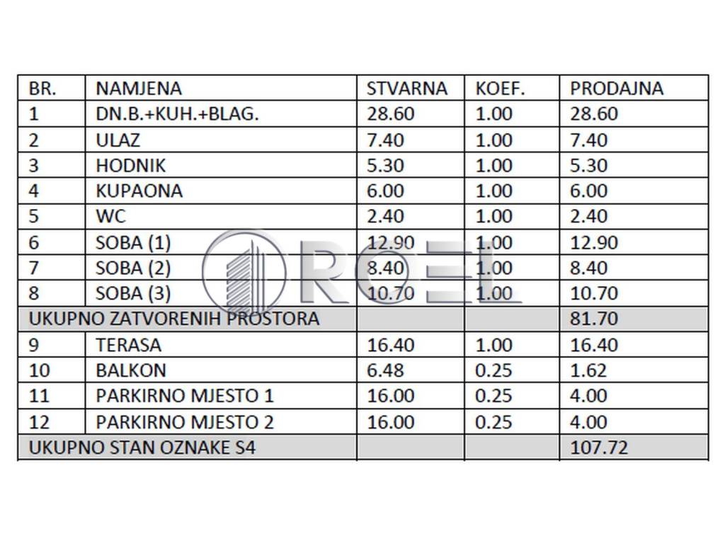 Navedeni stan (S4) nalazi se na prvom katu urbane vile sa sveukupno 4 stana. Stan se sastoji od ulaznog hodnika, tri spavaće sobe, dnevnog boravka s kuhinjom i blagovaonom, kupaonice s wc-om, zasebnog toaleta, lođe veličine 16.40 m2 (pripadak stanu i koeficjent je 1) i nenatkrivenog balkona veličine 6.48 m2 (neto 1.62 m2). Stan će biti opremljen vrhunskom stolarijom, klima uređajem, protuprovalnim vratima. Podovi će biti obloženi prvoklasnim parketom i keramikom. Grijanje je podno s dizalicama topline.