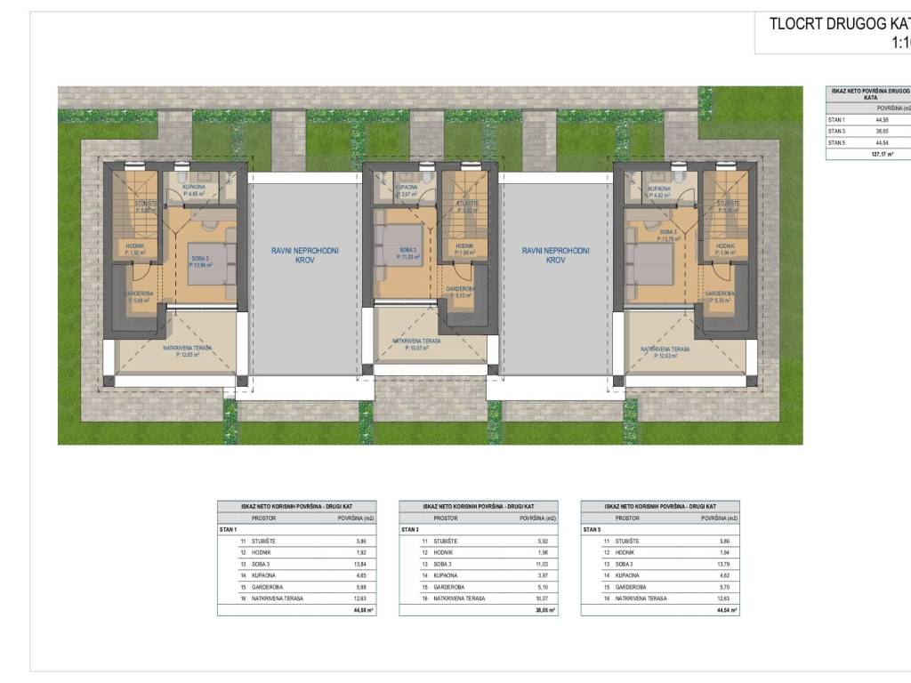 Zbog svoje orijentacije i velikih staklenih površina, unutrašnjost prima obilje prirodnog svjetla. Vlasnici kućnih ljubimaca i oni kojima je eksterijer jednako važan kao i interijer, vjerojatno će cijeniti vrt koji okružuje kuće i tamo pronaći svoje omiljeno mjesto.