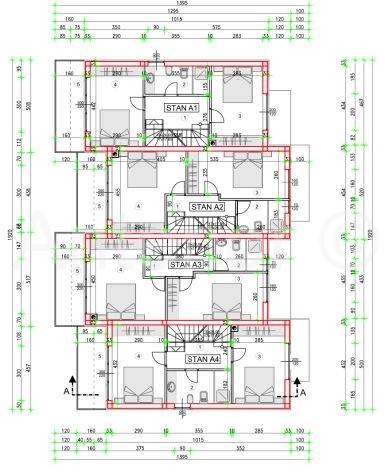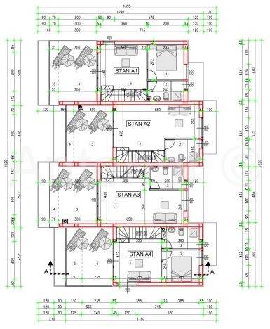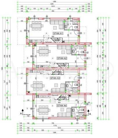Apartman se sastoji od ulaznog trijema, kuhinje sa blagavaonom i dnevng boravka, kupaone i natkrivene terase u prizemlju, na katu od predsoblja, dvije spavaće sobe, kupaone i terase te na drugom katu od dnevnog boravka, spavaće sobe, kupaone i terase.