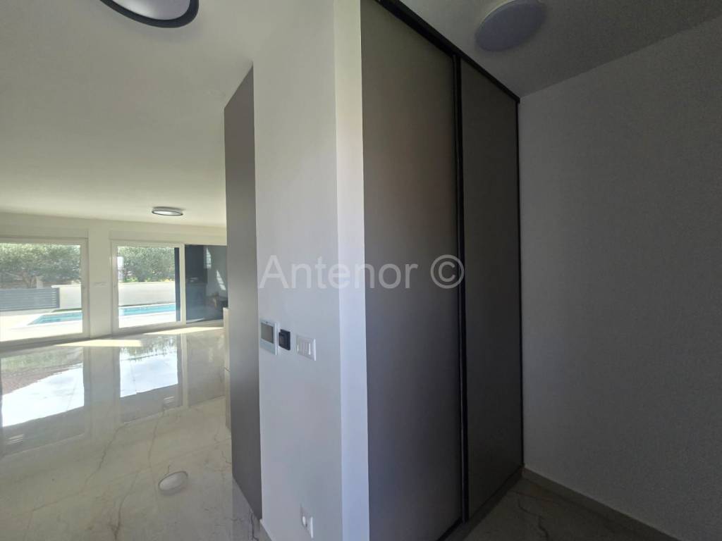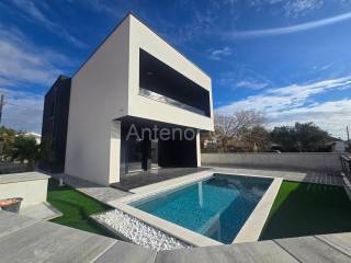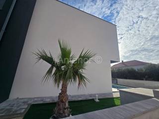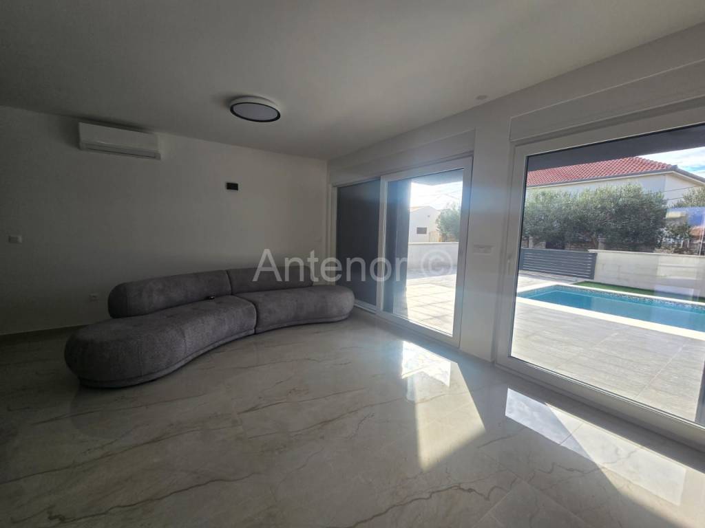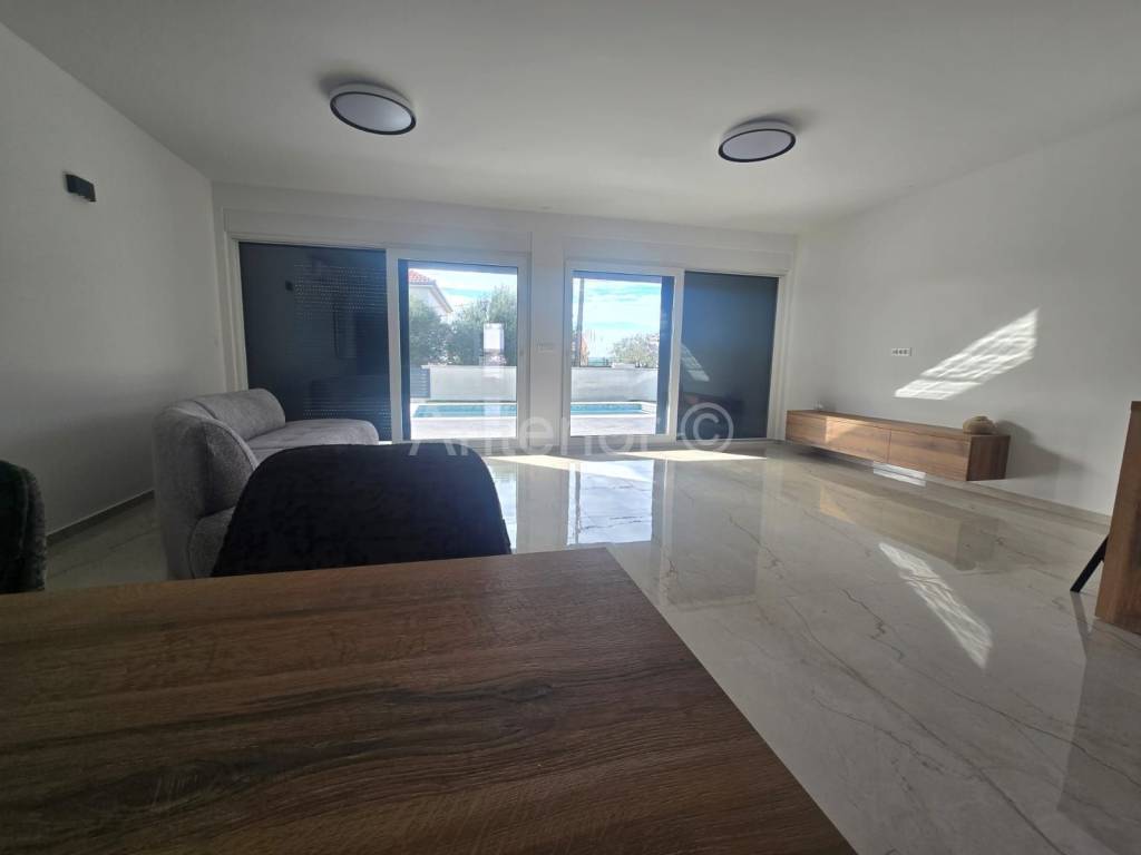 Privlaka- kućas bazenomu novogradnji, 300 m od mora i plaže. Kuća se sastoji od prizemlja i 1. kata. U prizemlju se nalazi hodnik, dnevni boravak s kuhinjom i blagovaonicom, wc, praonica i spremište. Iz dnevnog boravka se kroz velike staklene stijene izlazi na natkrivenu terasu površine 20 m2i dvorište gdje se nalazibazen dimenzija 7 m x 3,6 m. Unutarnjim stubištem dolazi se na1.katgdjese nalazi spavaća soba s vlastitom kupaonicom, te još dvije spavaće sobe i kupaonica. Dvije spavaće sobe imaju izlaz nanatkriveni balkon sa kojeg se prostire pogled na more. Kuća se nalazi u mirnom predjelu mjesta Privlaka idealna za život preko cijele godine i najam.