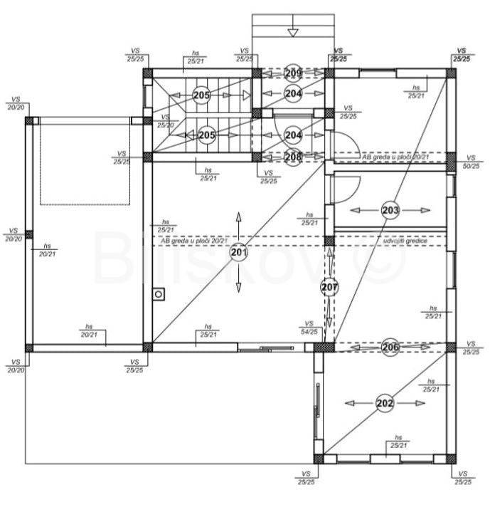Na katu kuće se nalazi hodnik, dvije spavaće sobe i dvije kupaonice te terasa.