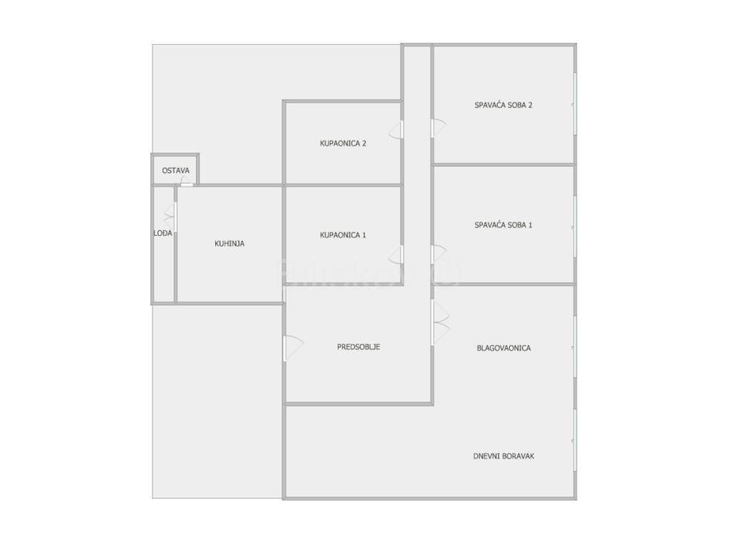 Stan se sastoji od ulaznog predsoblja, velikog open space prostora gdje se nalazi blagovaonica, dnevni boravak i biblioteka, zasebne kuhinje sa ostavom i izlazom na loggiu, hodnika, dvije spavaće sobe, dvije kupaonice i renoviranog spremišta u podrumu površine 6m2.