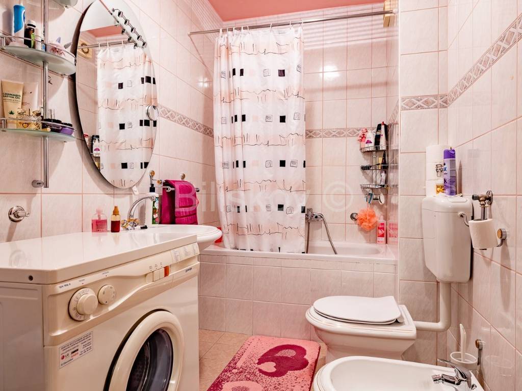 Sjajno iskorišten prostor sastoji se od ulaznog hodnika, velikog dnevnog boravka koji je integriran sa blagovaonicom i kuhinjom, dvije spavaće sobe, od kojih jedna ima garderobu, dvije kupaonice sa WC i bideom i dva balkona.