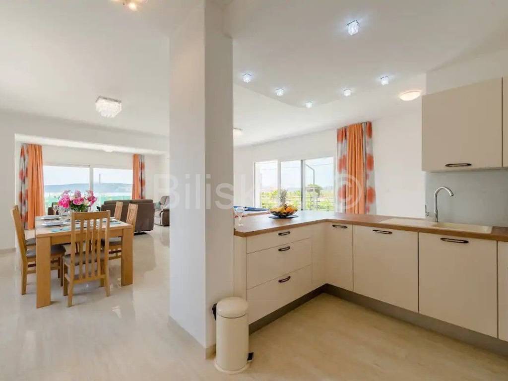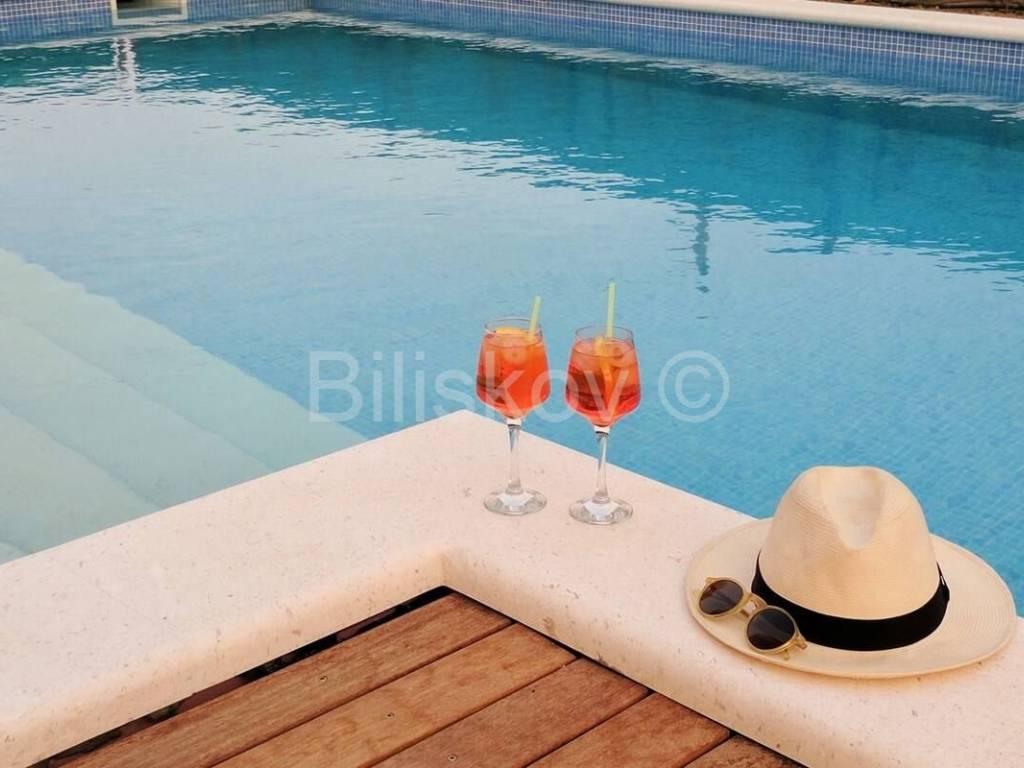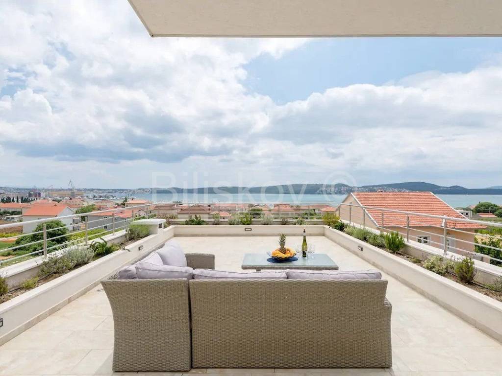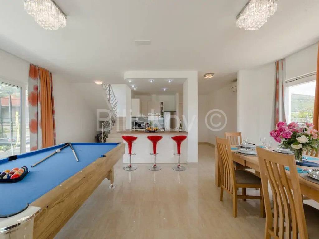 Trogir, Seget Gornji, troetažna dizajnerska vila ukupno korisne površine 240m2 s parkingom i bazenom. Prva etaža sastoji se od kuhinje s trpezarijom i dnevnim boravkom, wc-a, te velikom terasom s izlazom na bazen. Tri spavaće sobe od kojih svaka ima svoje kupatilo i balkon s pogledom na more. Nalaze se na drugoj etaži. Treća etaža sastoji se od velike terase s tušem i vrtom te omogućuje trenutke neometanog opuštanja. Kuća je klimatizirana(svaka prostorija), dizajnerski uređena i dostupna dugoročno. Od plaže udaljena je 300m, grad Trogir je udaljen 900m. Polog iznosi jednu mjesečnu najamninu. Agencijska provizija iznosi jednu mjesečnu najamninu uvećanu za pripadajući PDV. www.biliskov.com ID:10807-1