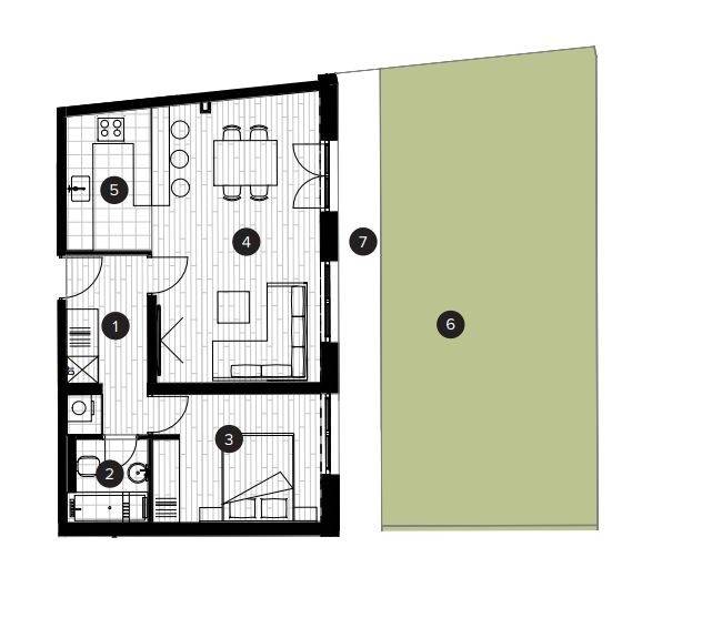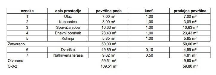 Stan će se nalaziti u prizemlju zgrade, ukupne prodajne površine 59,80 m (ukupna neto površina poda iznosi 109,51 m), a sastoji se od ulaznog prostora, open space dnevnog boravka s blagovaonicom, kuhinje, spavaće sobe, kupaonice, natkrivene terase i dvorišta.