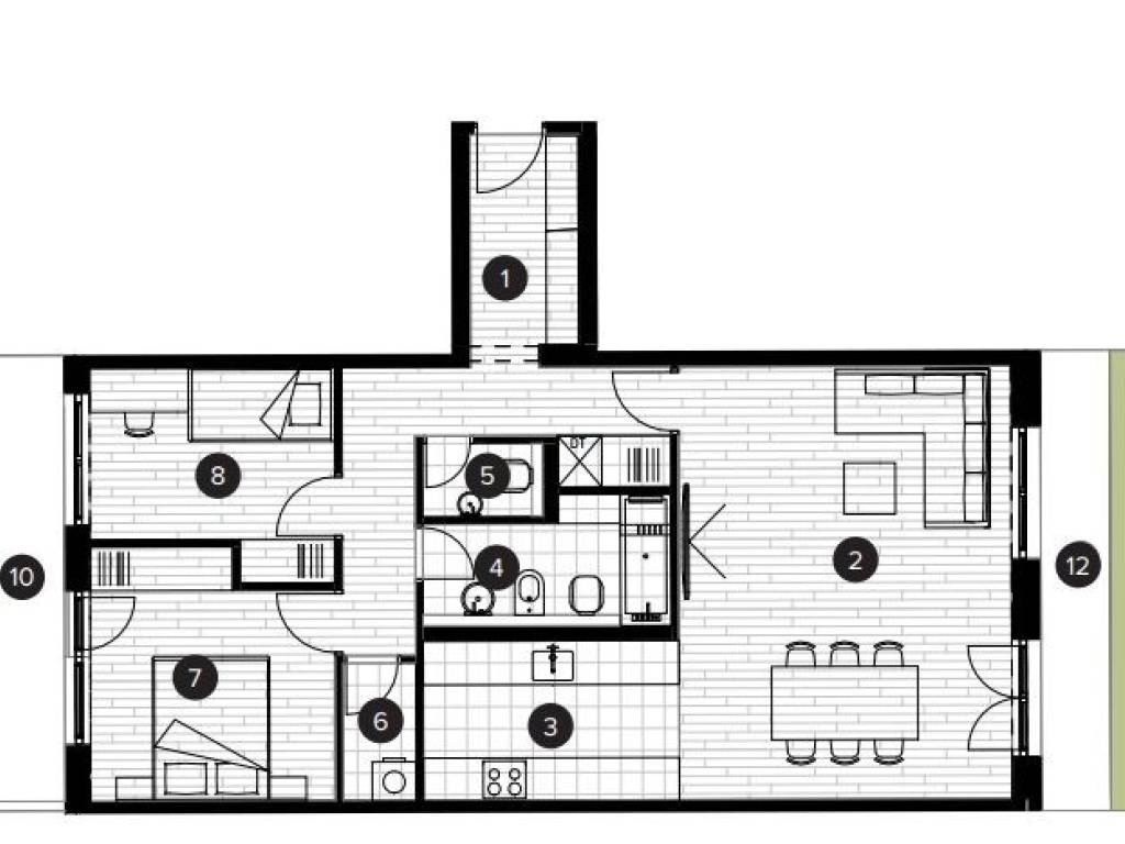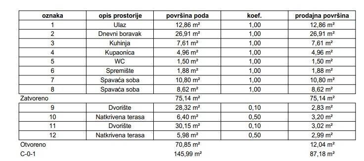 Stan će se nalaziti u prizemlju zgrade, ukupne prodajne površine 87,18 m (ukupna neto površina poda iznosi 145,99 m), a sastoji se od ulaznog prostora, open space dnevnog boravka s blagovaonicom, kuhinje, dvije spavaće sobe, kupaonice, zasebnog WC-a, natkrivene terase s obje strane stana, dvorišta s obje strane stana i spremišta.